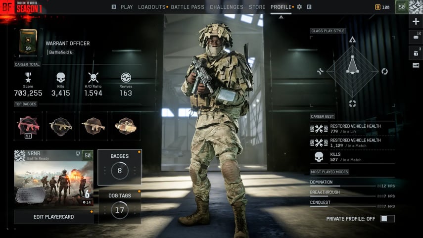 [ Battlefield 6 ] โญ Rank 50 + ๐ฃ 40 Gun Unlocked ๐ฅ 4 Max level guns ( mastery 50 ) ๐ 12 Camo Unlocked ๐ซก Elite Badge for the Support Class ๐ซ 15 TOTAL DOG TAGS ๐Full access ๐ชฝ game Purchased on Steam ๐ Handmade No cheats ๐ฅ