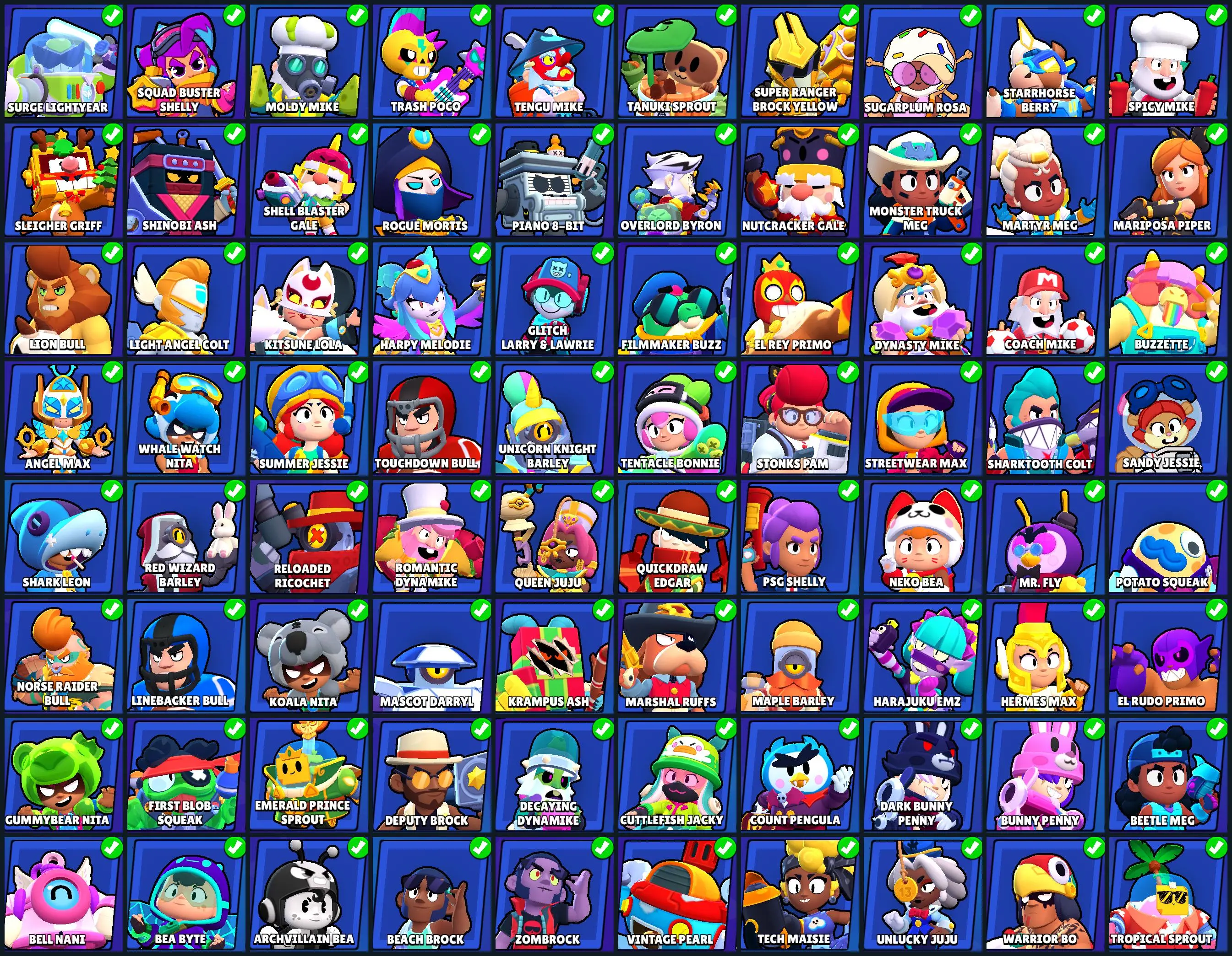 154 SKINS | 28100 TROPHIES | KITSUNE LOLA | HERMES MAX | FILMMAKER BUZZ | SURGE LIGHTYEAR | ROGUE MORTIS | SUPER RANGER BROCK YELLOW | SPICY MIKE | WARRIOR BO | PIANO 8-BIT | MARIPOSA PIPER | MOLDY MIKE | NUTCRACKER GALE | HIGH FLYER LOLA | 74 BRAWLERS