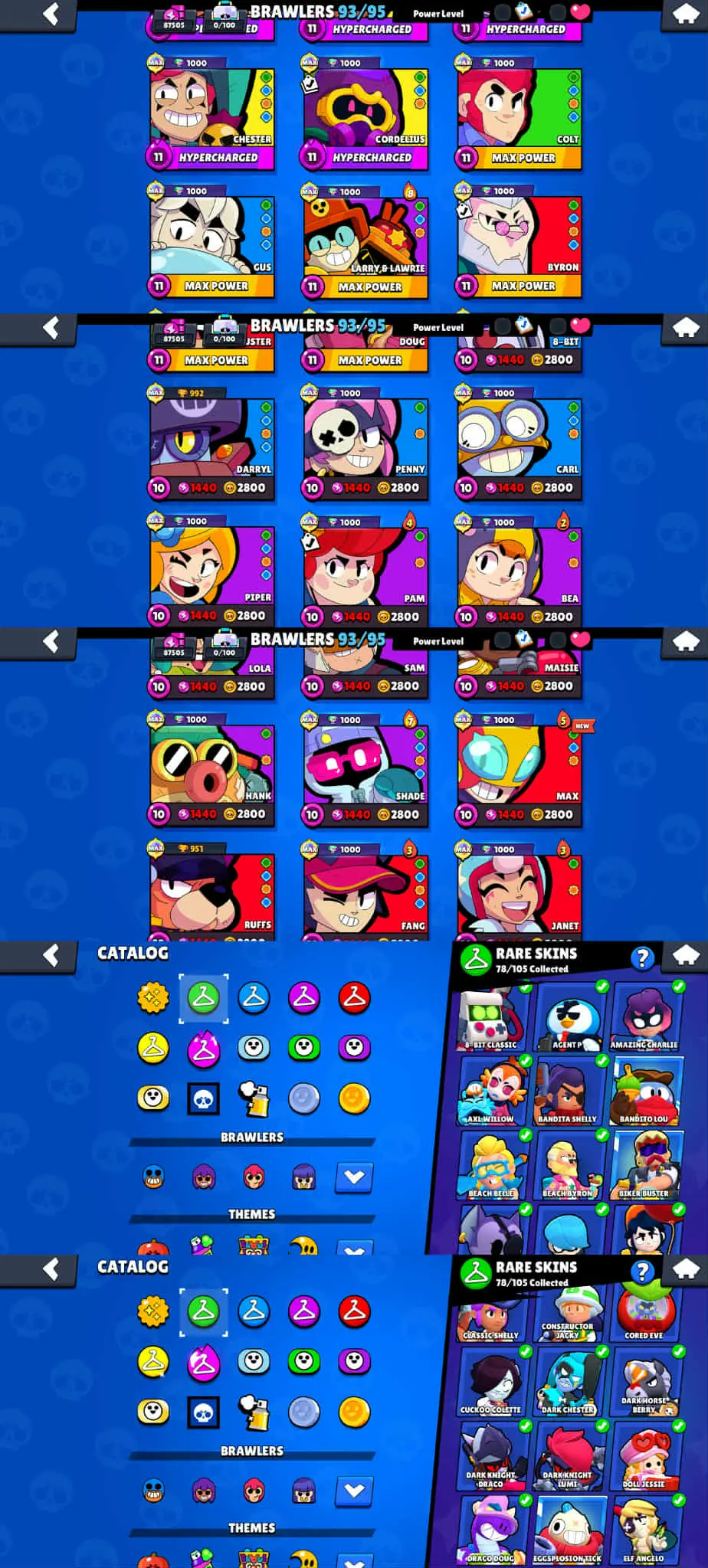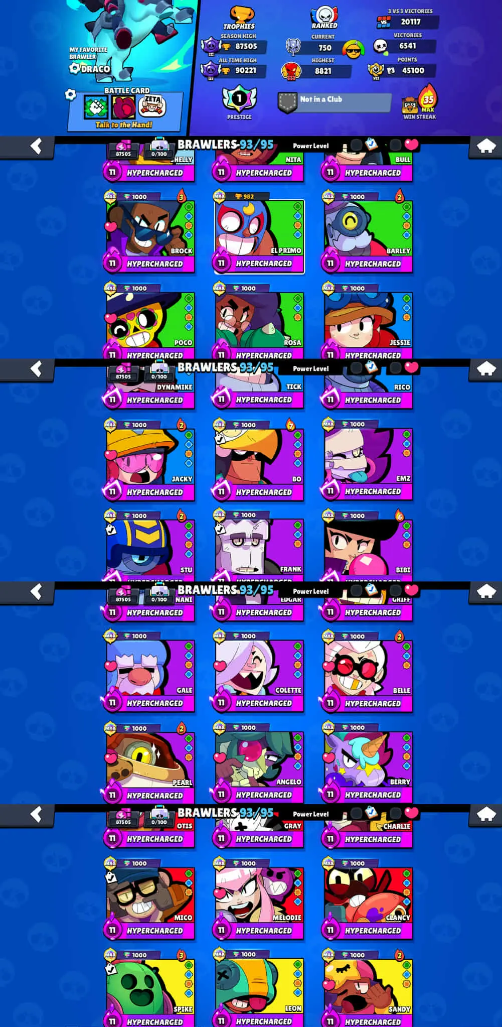 87.5k TROPHY| 56MAX POWER| 50 HYPERCHARGED | 1 PRESTIGE |35 MAX WIN STREAK|281 SKINS|493 PINS|197 SPRAYS|9 LEGENDARY SKINS AND MANY RARE SKINS|