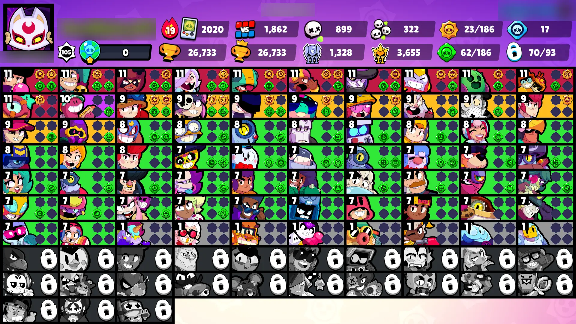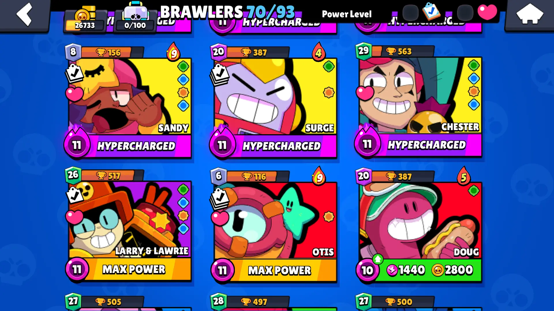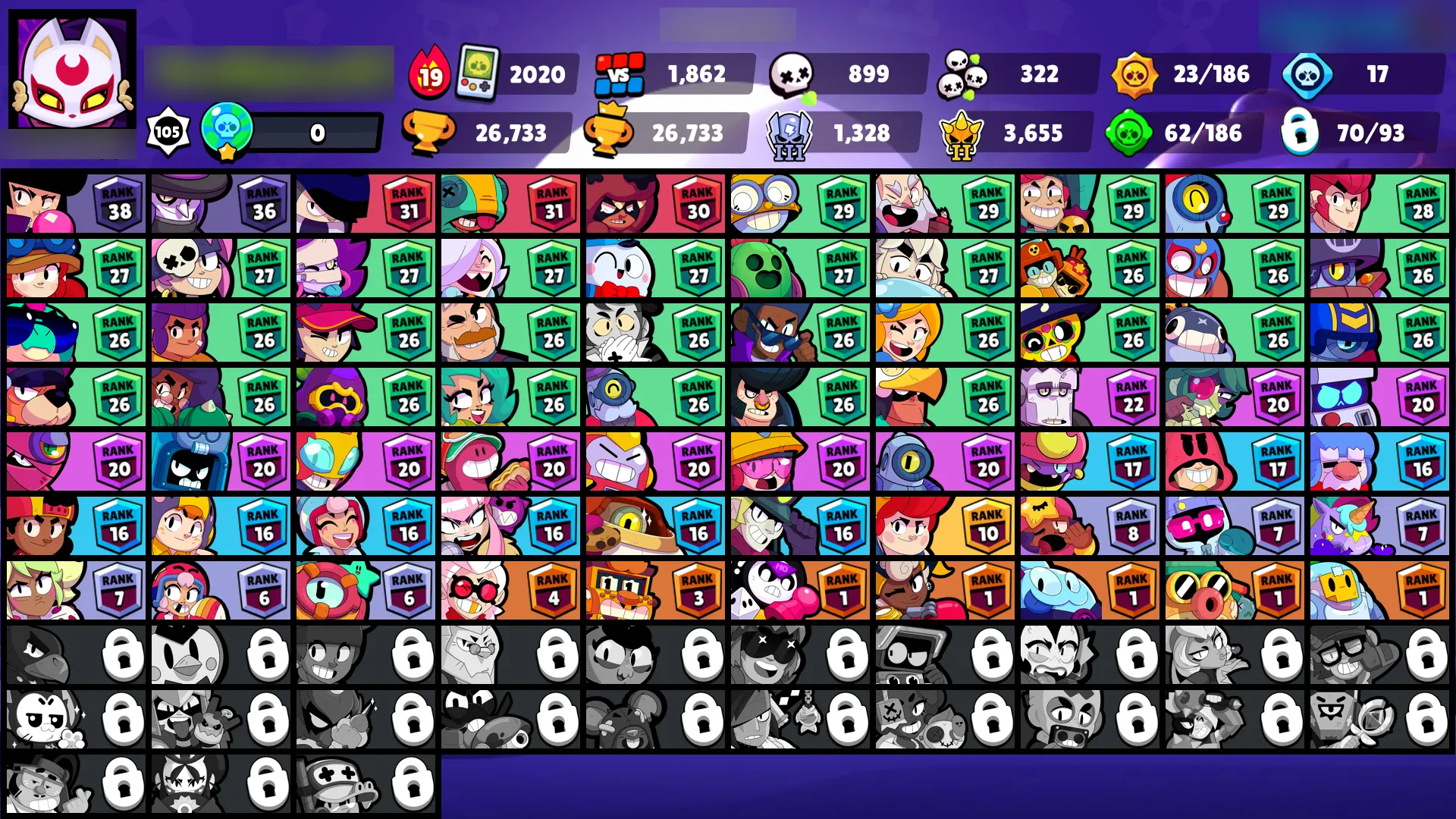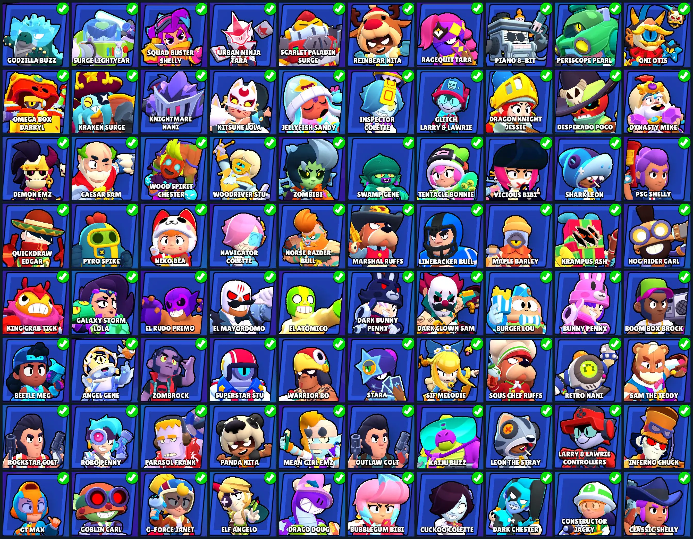 95 SKINS | 26308 TROPHIES | KITSUNE LOLA | GODZILLA BUZZ | SURGE LIGHTYEAR | REINBEAR NITA | WARRIOR BO | PIANO 8-BIT | WOODRIVER STU | CAESAR SAM | GALAXY STORM LOLA | DARK CLOWN SAM | ANGEL GENE | GLITCH LARRY & LAWRIE | URBAN NINJA TARA | 69 BRAWLERS