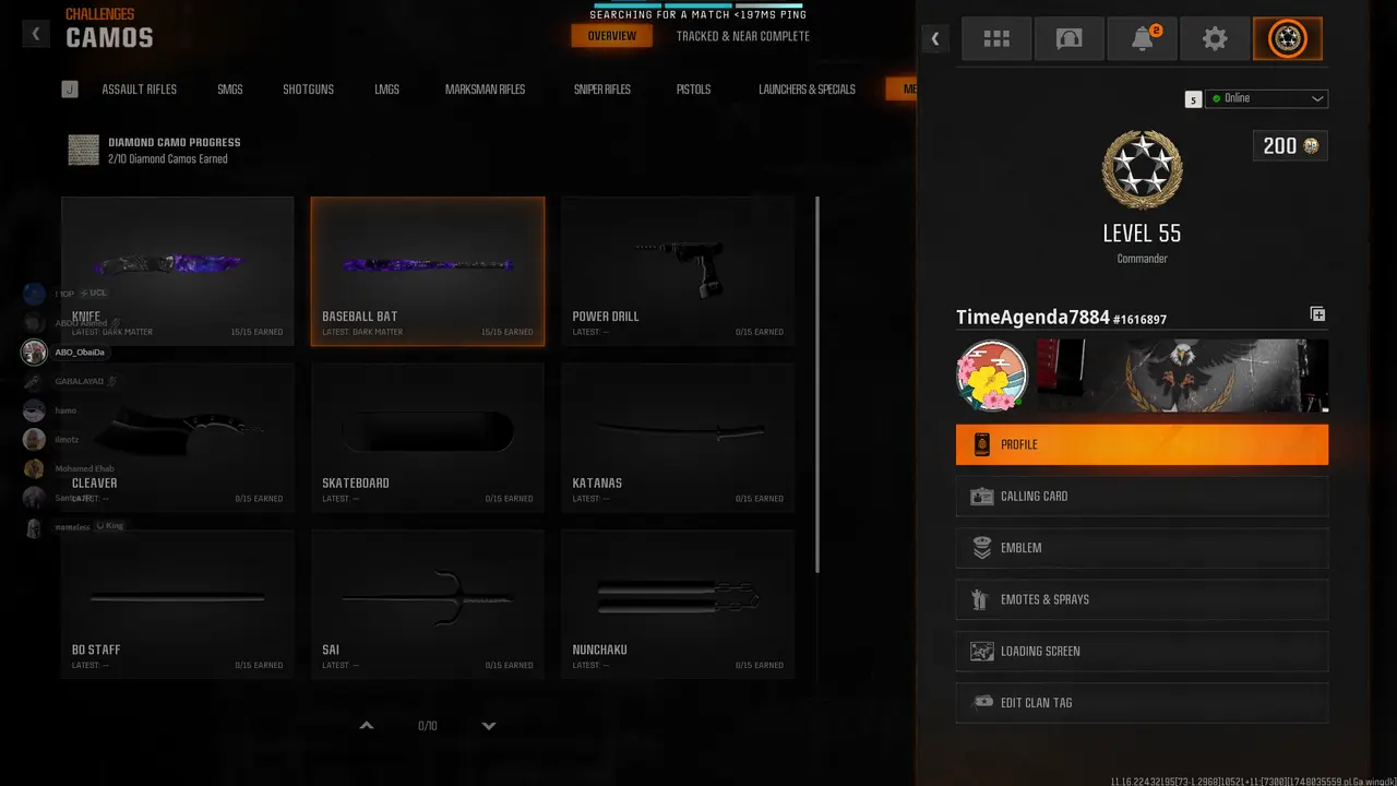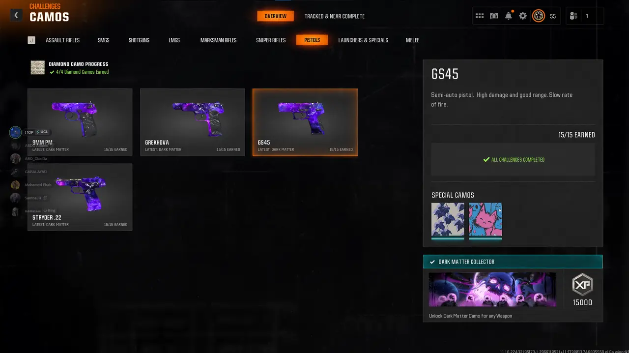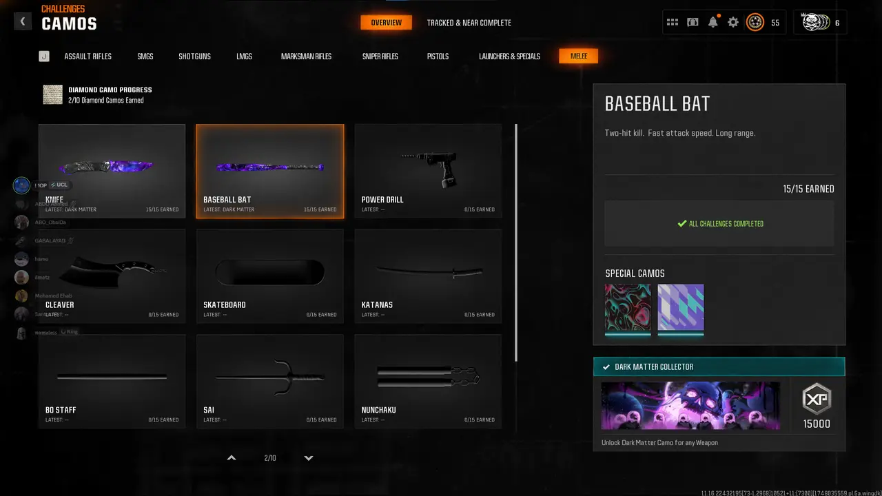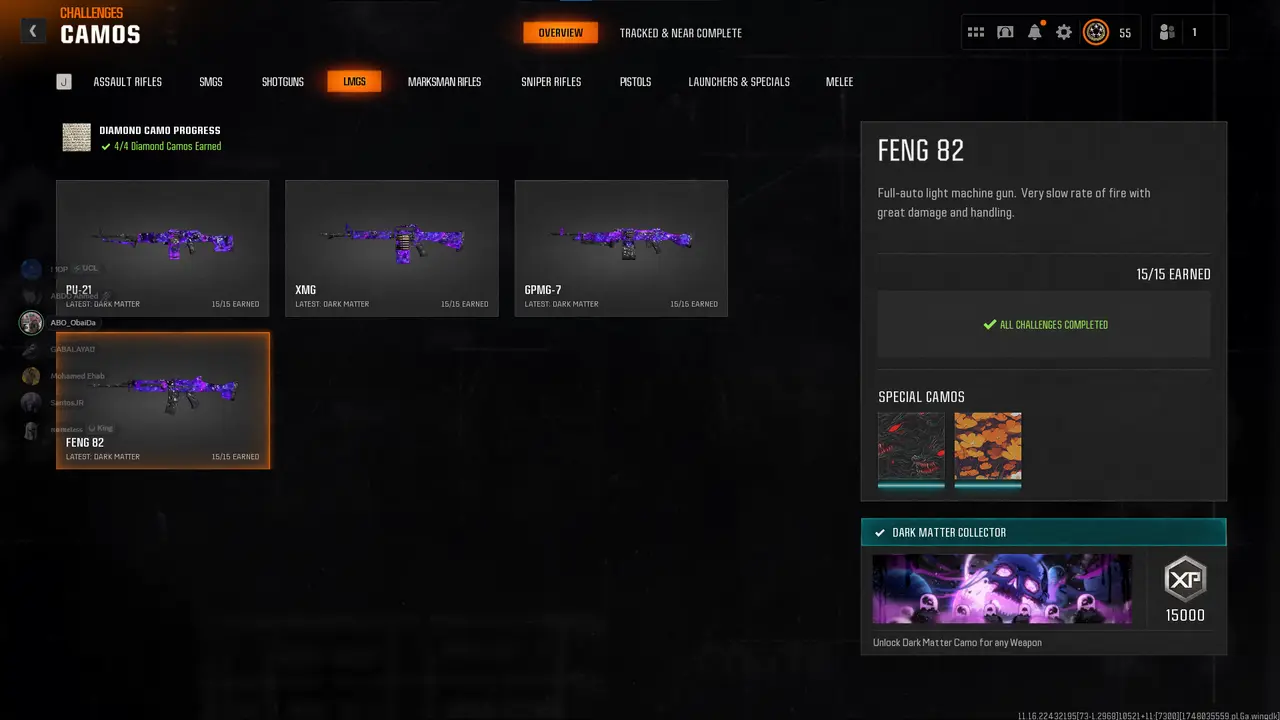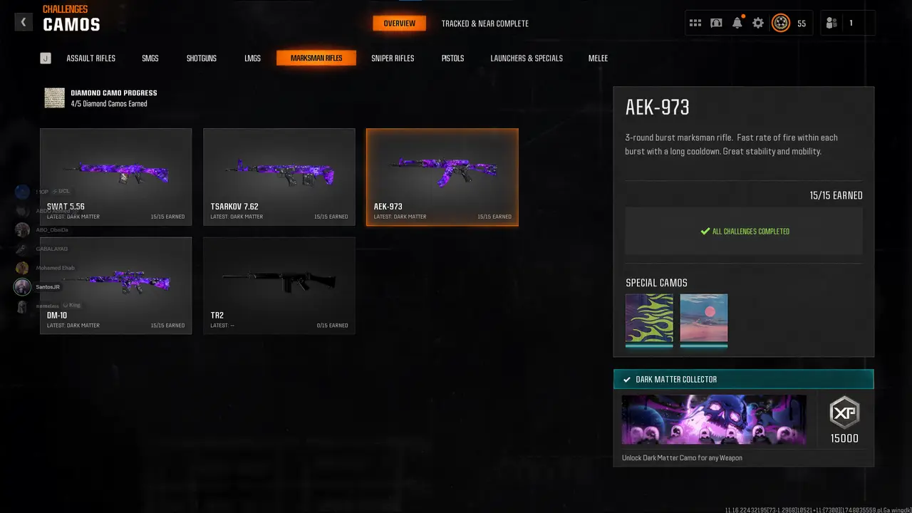 Dark Matter legit on 33 BO6 guns 💎 Level 55 Prestige 1 🎐 Diamond camo complete 🪶 33x Dark Spine ⚔️ Full Gold camo set 🥠 Cross-platform linkable (STEAM / BNET / XBOX / PSN) 🎮 Verified Legit 🏆 Secure Transfer 🗝️
