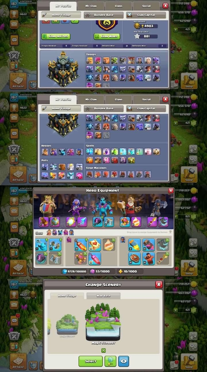 3 HELPER HUT UNLOCK ➠7 EPIC EQUIPMENT HIGH ➠9 PAID SKIN ➠HEROS: 65/91/61/55/25 ➠GOLDEN WALL ➠TH 17 ➠XP 187 ➠LOTS OF MAGIC ITEM