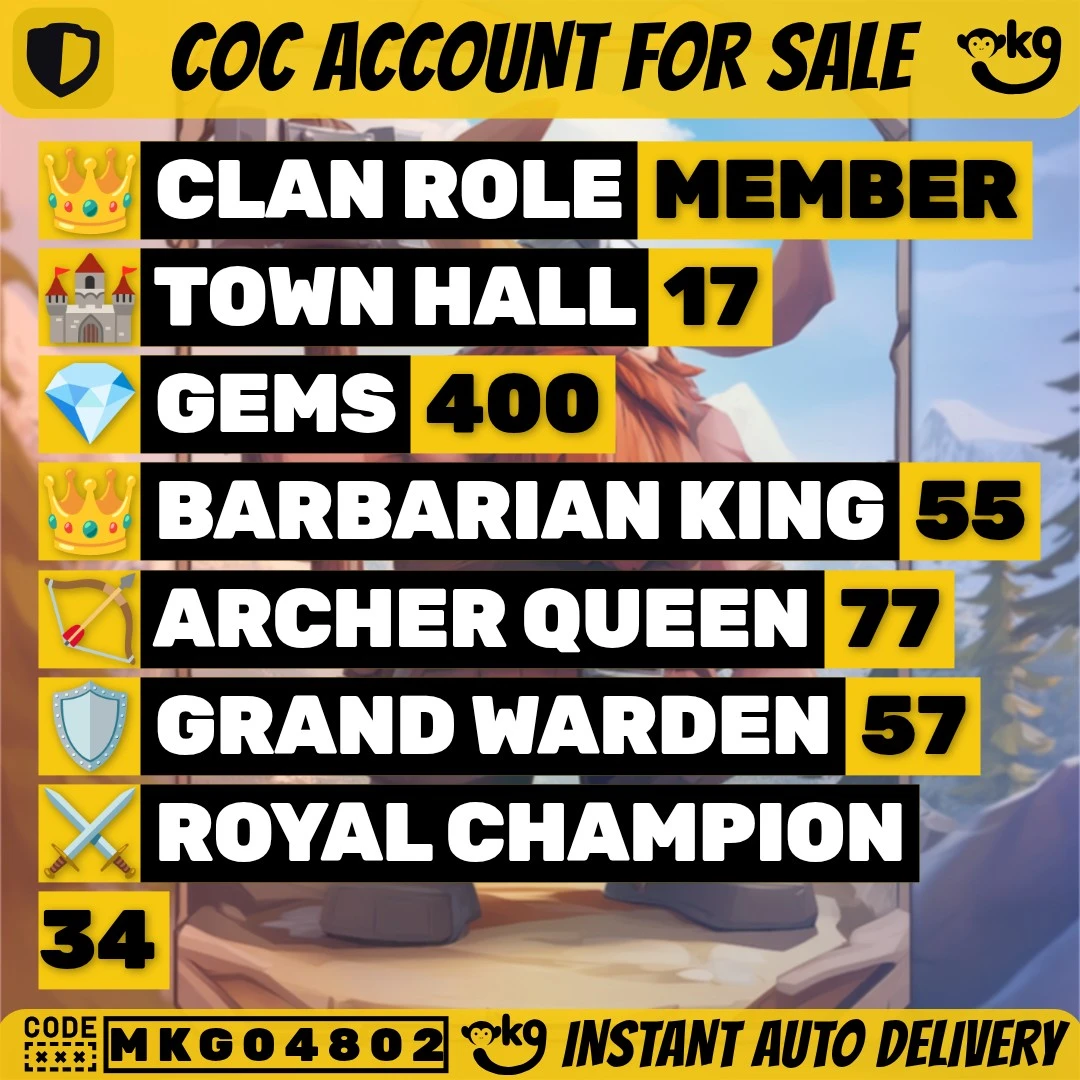 ✨ Clash of Clans 🏆 TH17 SEMI ✨ 9 Epic Equipments ✨ Heroes 55-77-64-57-34 ✨ 400+ Gems 🔰 Complete Access ✨ Instant Delivery !MKG04802