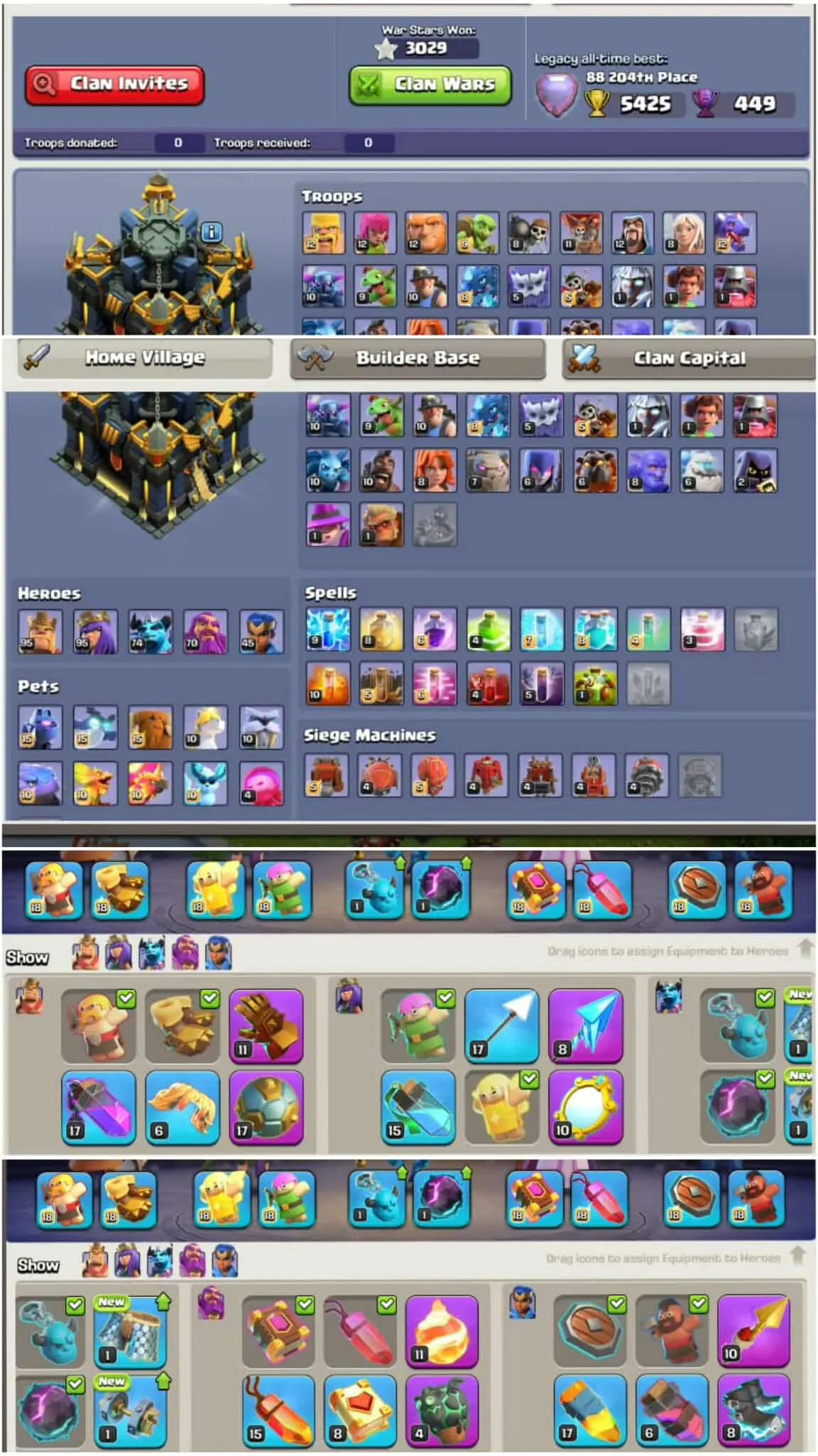 【Heros: 95-95-74-70-45】Th17 Max✮8 Epic ~650+ Cwl Medel ~Max Wall ~3000+ War Star ~Full Magic Item ~Full Access
