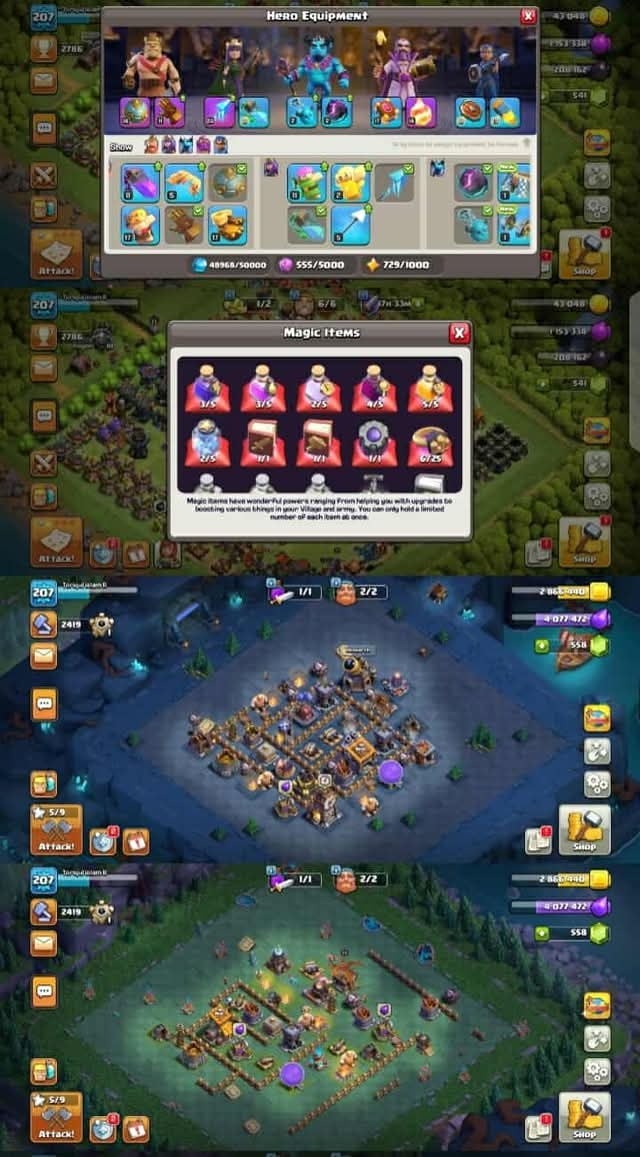 TH 17 DEFENSE MAX ➠ CWL MEDEL 800+ ➠HIGER LVL EQUIPMENT ➠GOOD TROPOS LVL ➠XP 207 ➠NC FREE ➠HEROS:-61-78-45-33 ➠ LOTS OF MAGIC ITEMS
