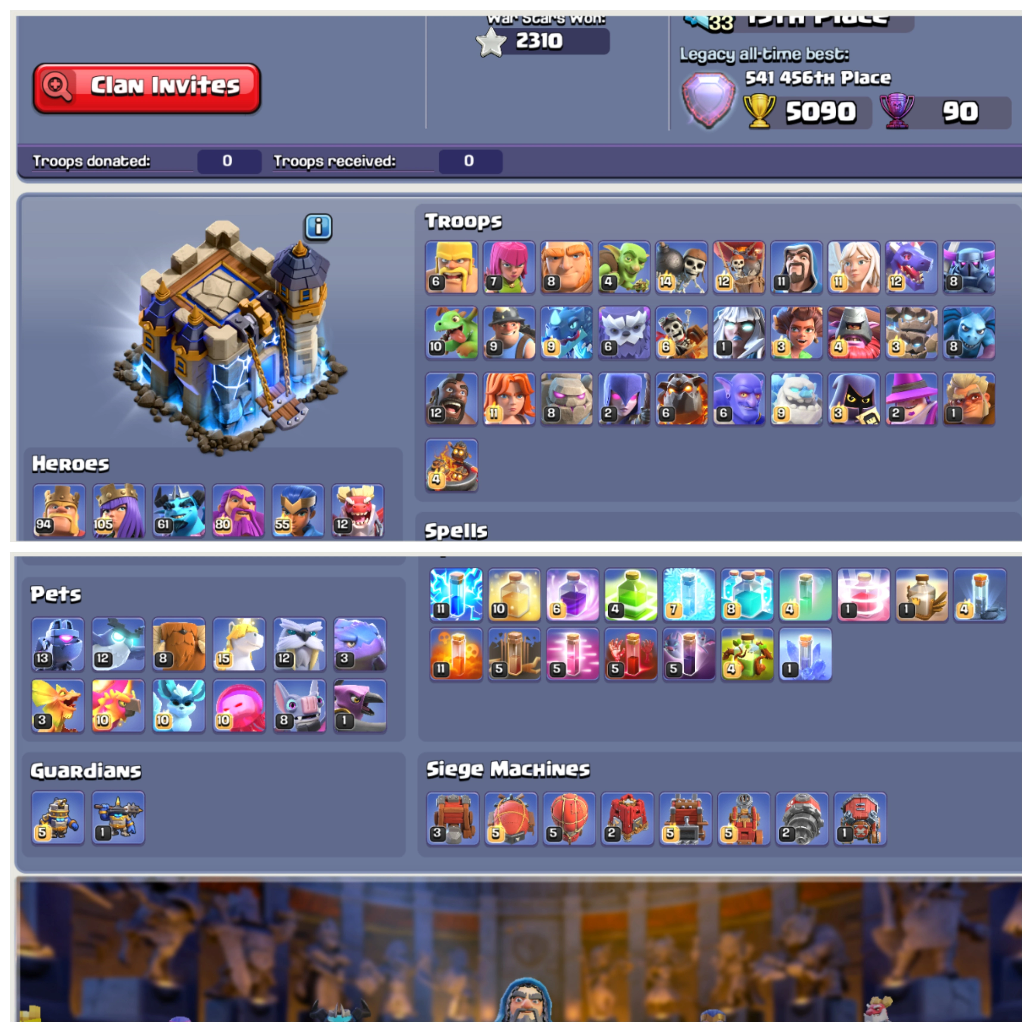 TH 18 Mostly Max 🌠 XP 231 🌠 10 Epic Equipments 🌠 3 Heroes Fully Maxed Out 🌠 Laboratory Mostly Max 🌠 300+ CWL Medals 🌠 Instant Delivery