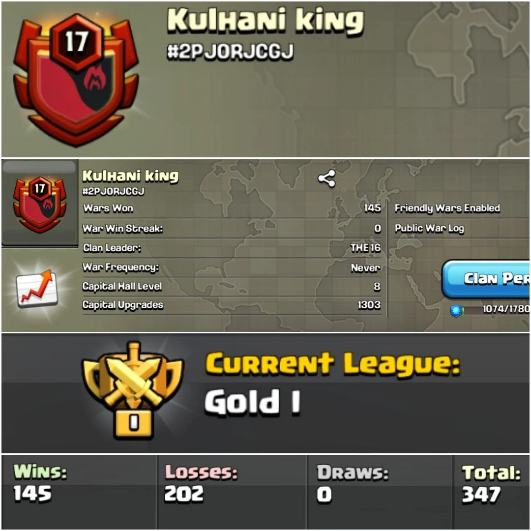 Level 17 | Name - Kulhani King | Clan Capital - 8 | Gold League | Fast Delivery