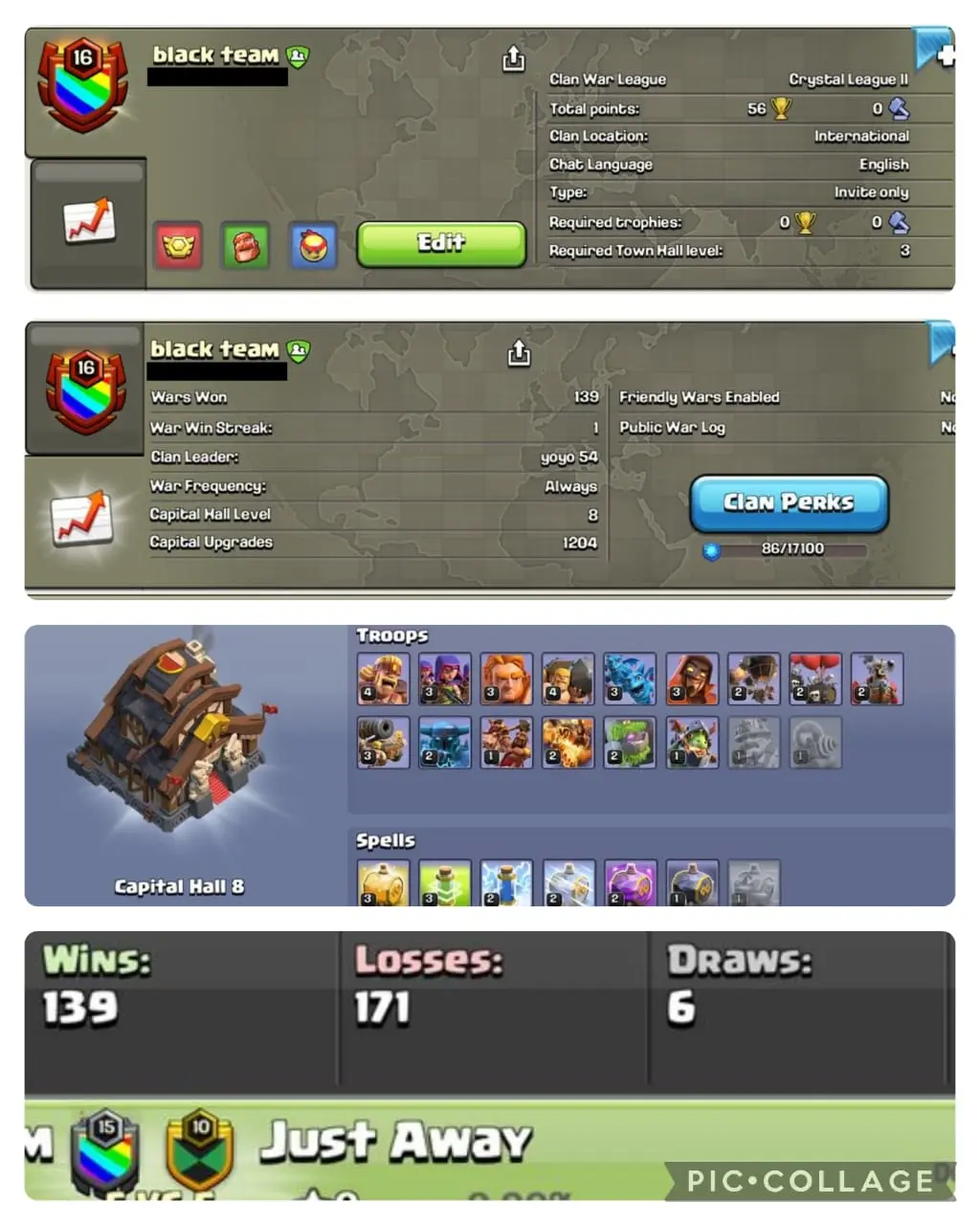 🔥NAME- black team | 💥LVL- 16 |☠️ WARLOG W-L-D: 139-171-6 | CWL LEAGUE : Crystal 2🏆 | CC: Almost 9!!⚡⚡