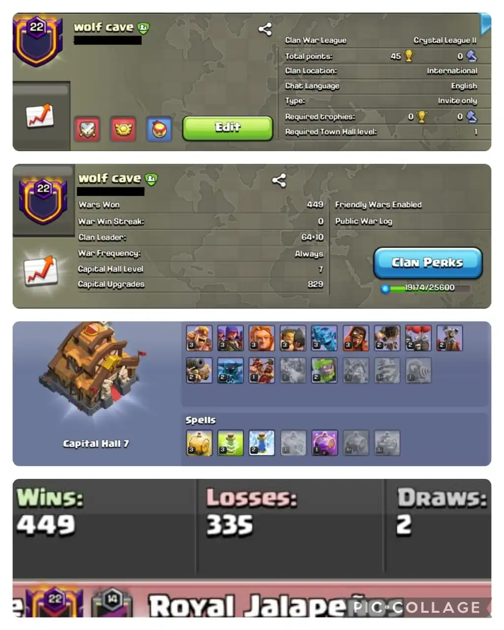 🔥NAME- wolf cave | 💥LVL- 22 |☠️ WARLOG W-L-D: 449-335-2 | CWL LEAGUE : Crystal 2🏆 | CC: NEAR 8 !!⚡⚡