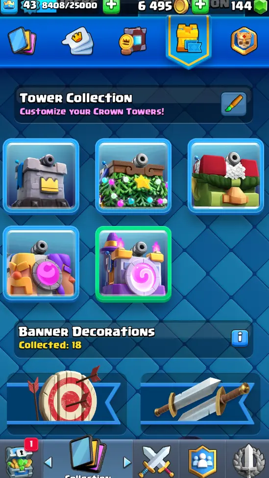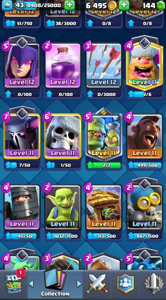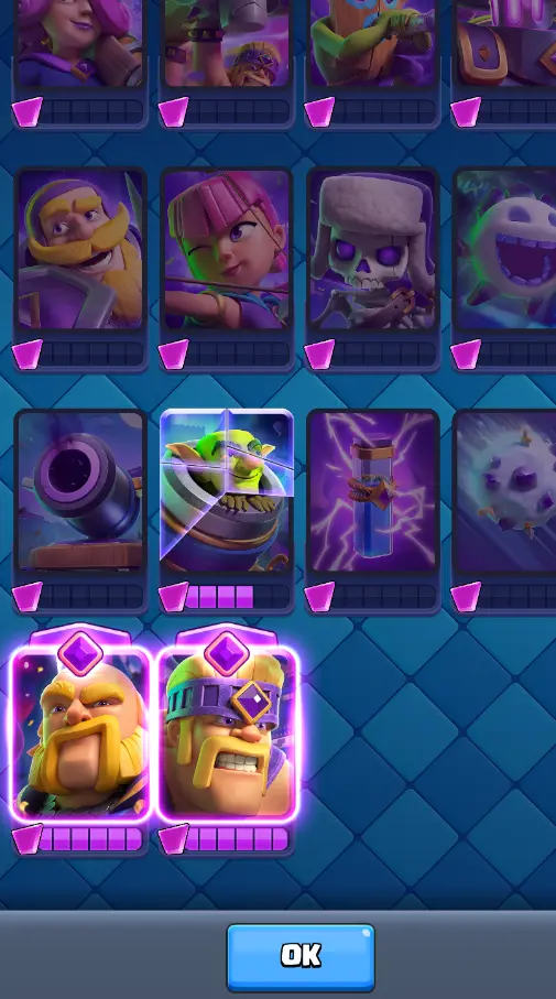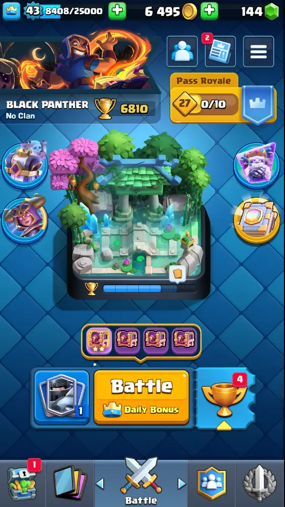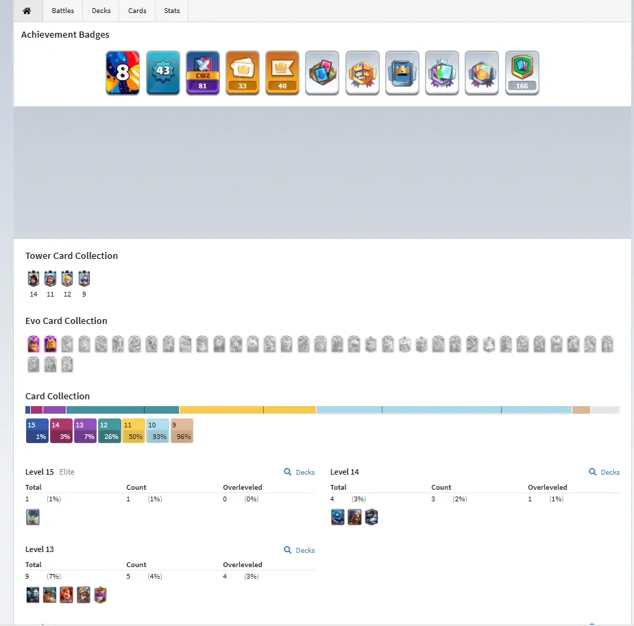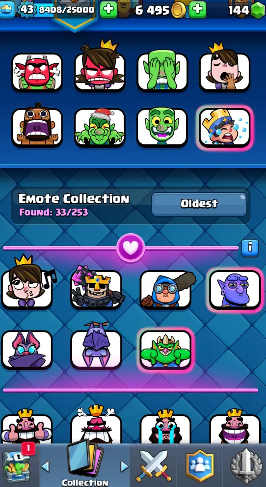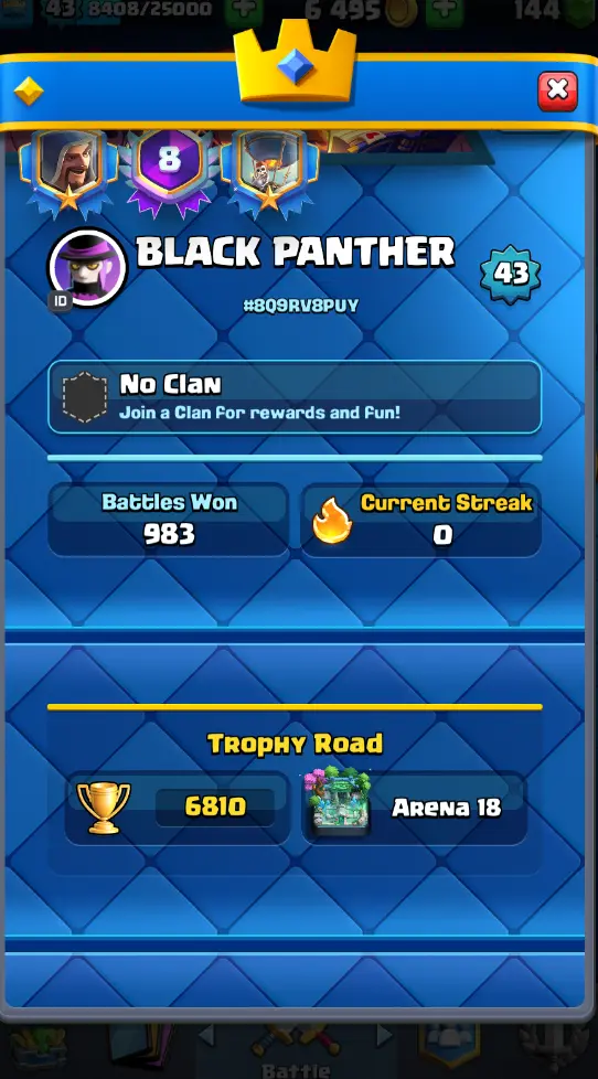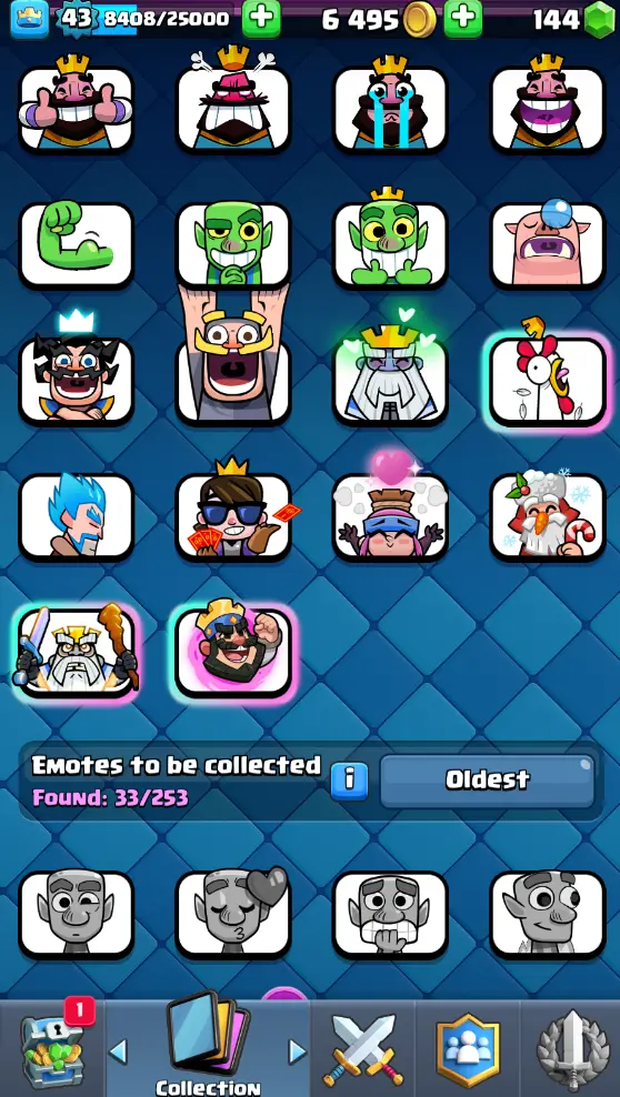 2017 account ✨ CR Lv.l 43 ✨6800 Trophy✨ 8 year badge✨ KT 14✨ 1 Elite Card ✨ 4 Max Card✨ 2 Evo Card✨ 33 Emotes