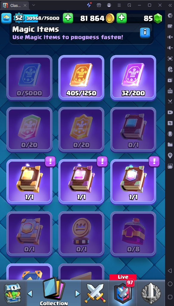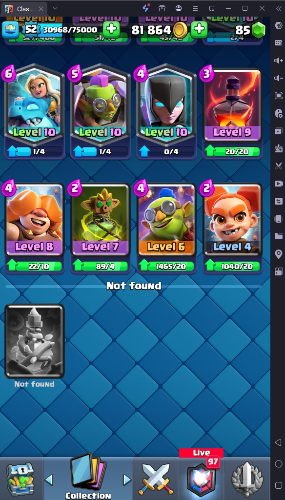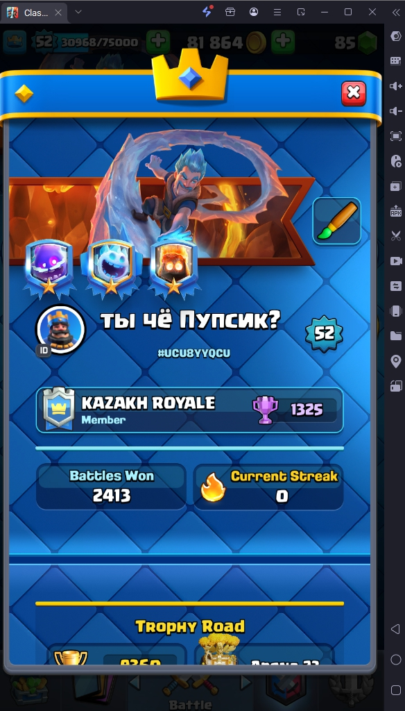 9360 TROPHY 🏆 52 LVL 💯 KT 14 👑 120 CARDS ♦️ 0 MAX CARDS 👑 2 ELITE CARDS 🔮 8 EVO 💯 EMOTE 79 🎭 #UCU8YYQCU ⸱ TAG ACCOUNT ♥️