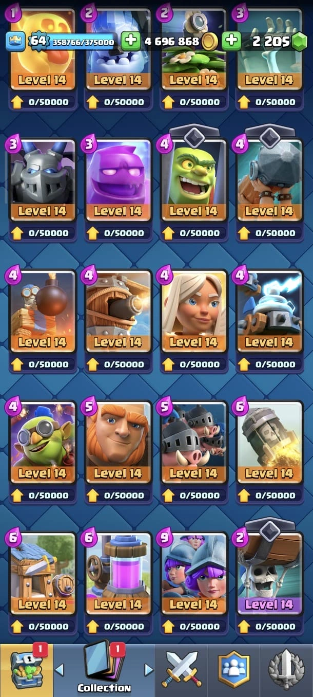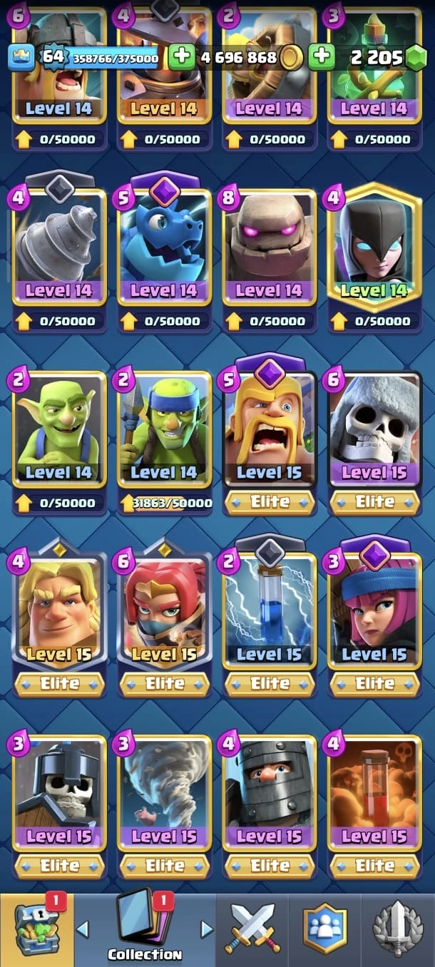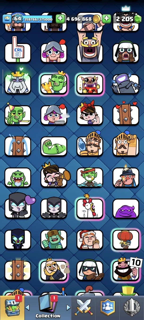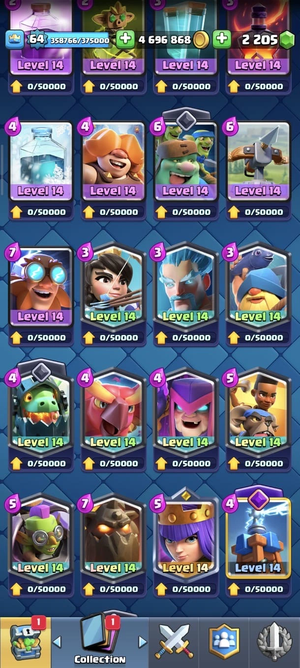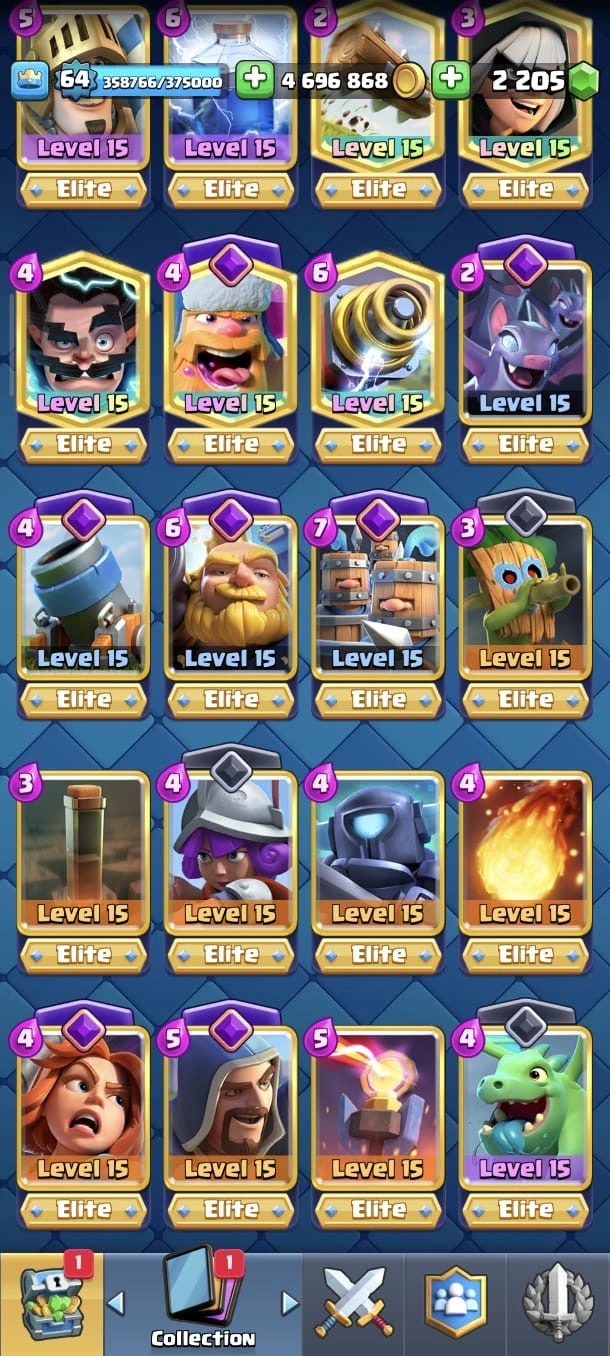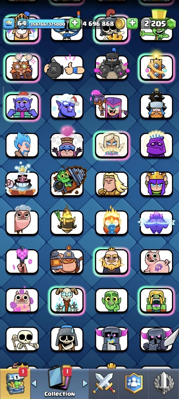 CR LV 64 🔥 Elite 48 🔥 Max Cards 115 ( Allmost max) 🔥 Evo 17 🔥 Emote 194 🔥 Trophy 12150 🔥 Change name free🔥