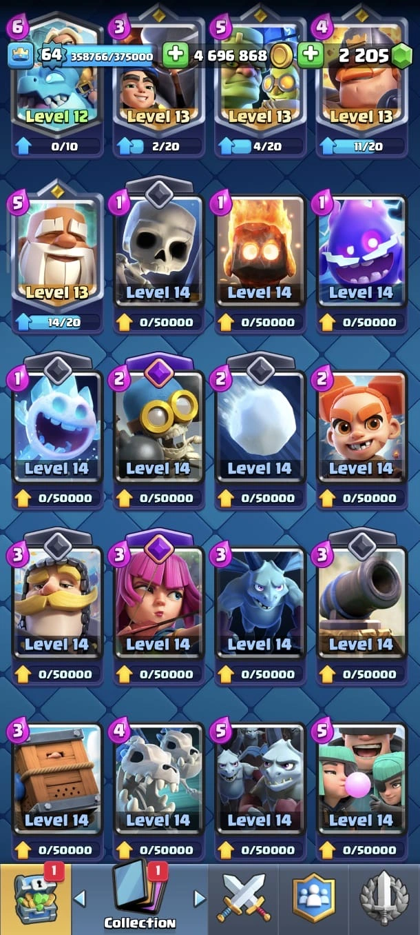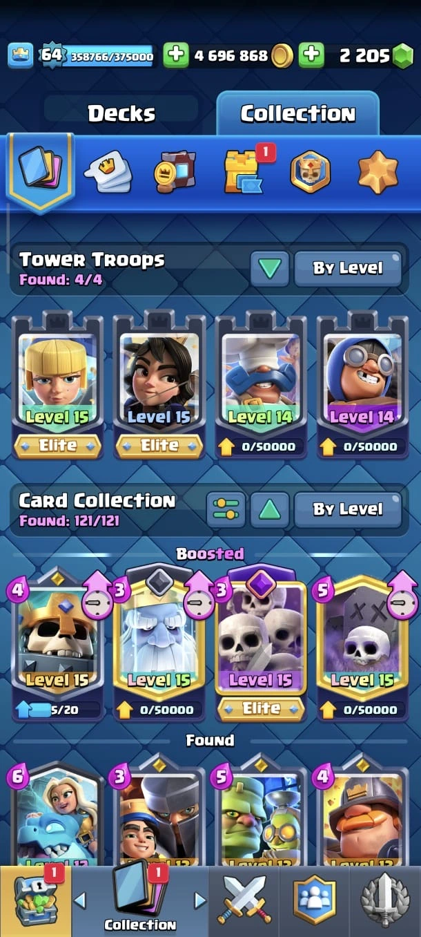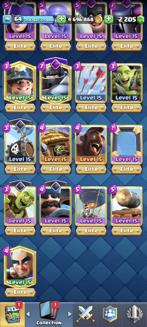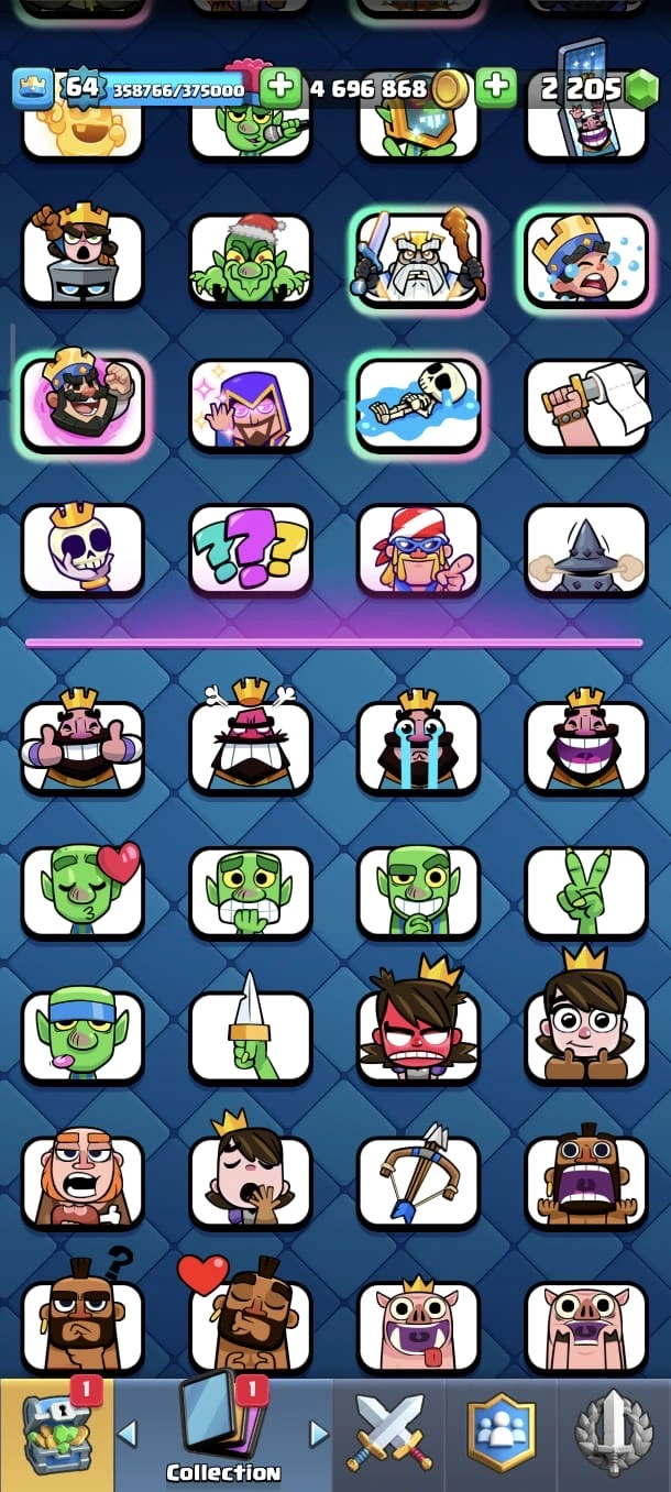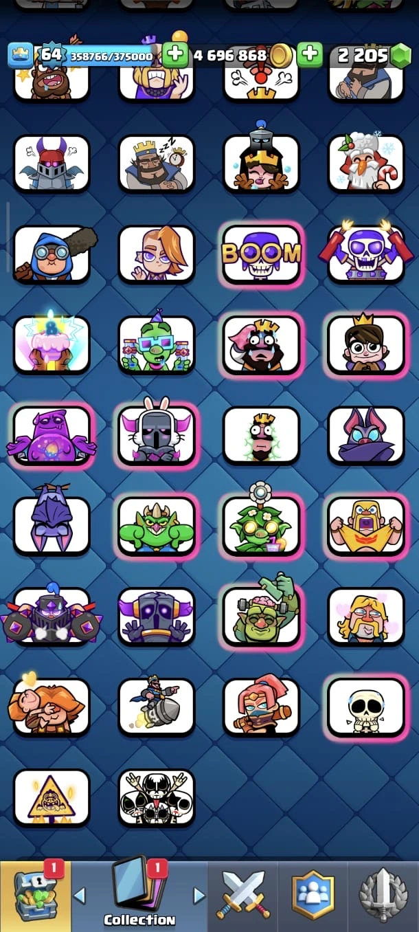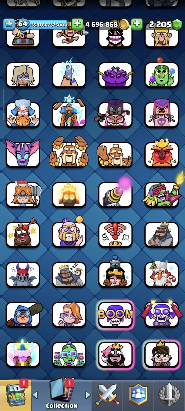 CR LV 64 🔥 Elite 48 🔥 Max Cards 115 ( Allmost max) 🔥 Evo 17 🔥 Emote 194 🔥 Trophy 12150 🔥 Change name free🔥