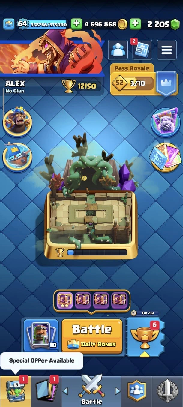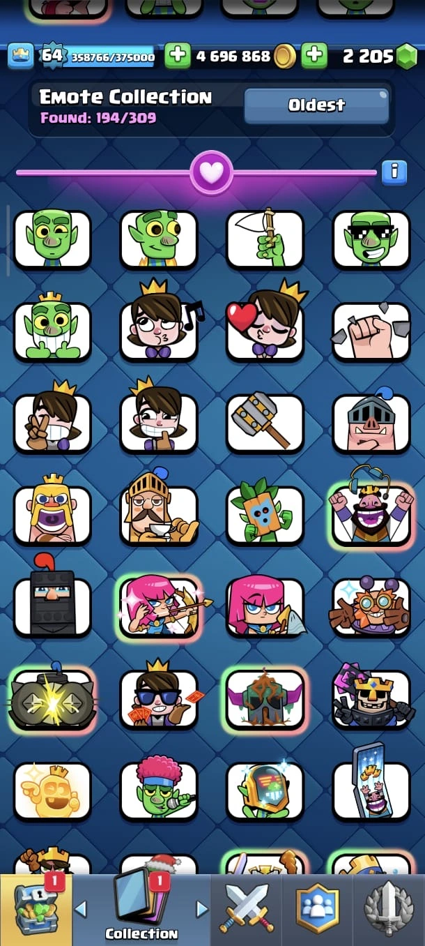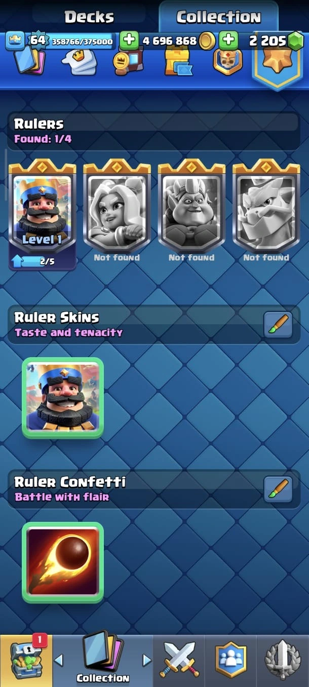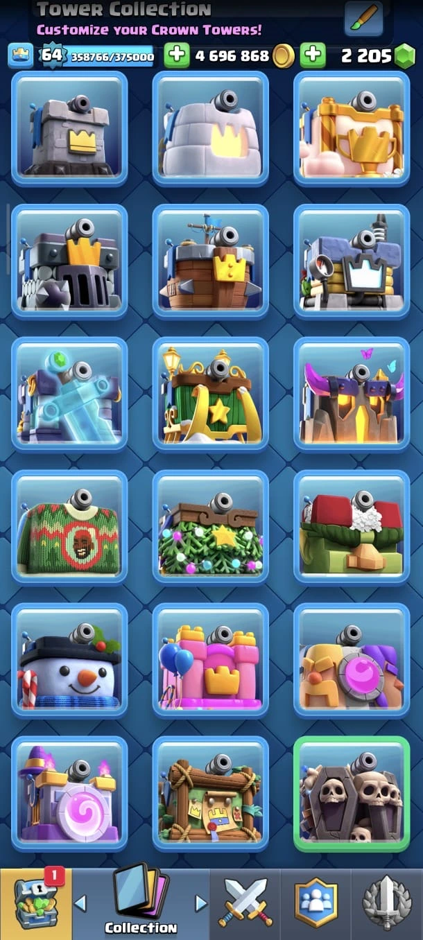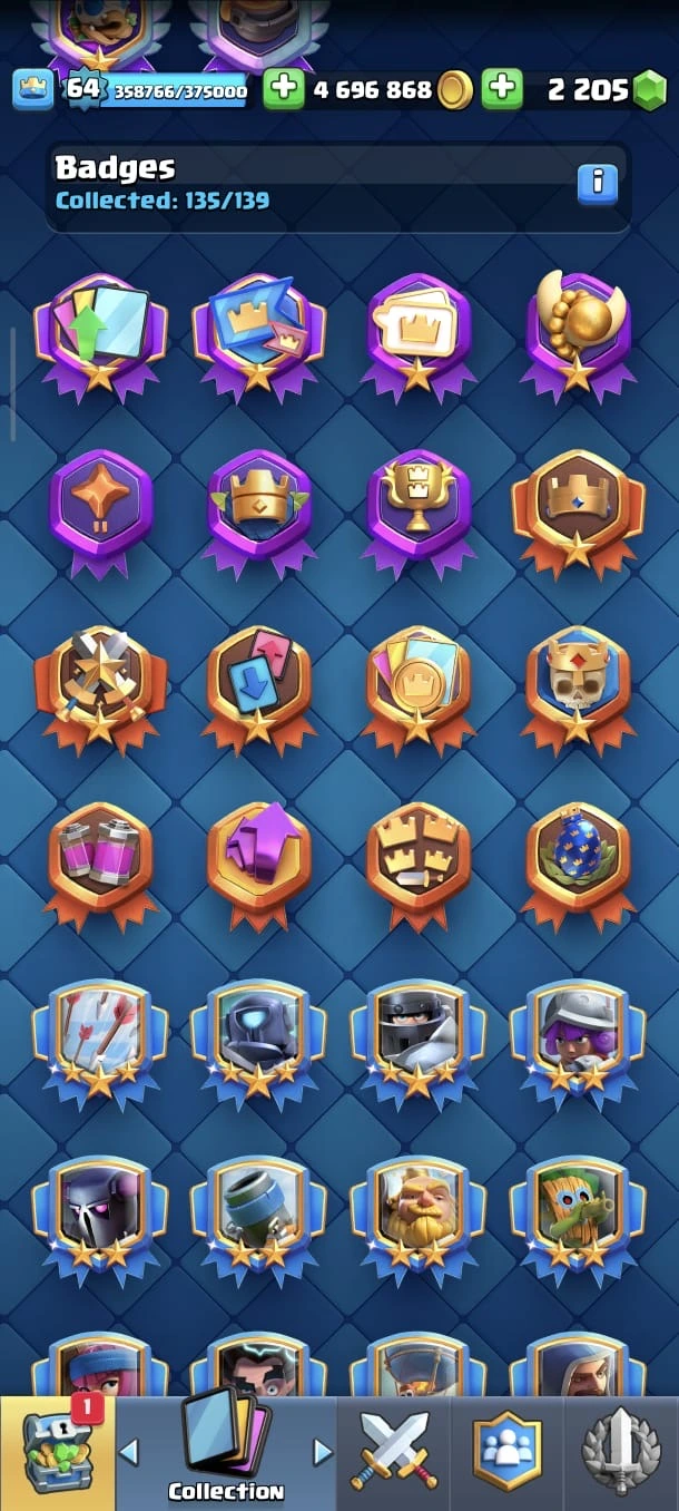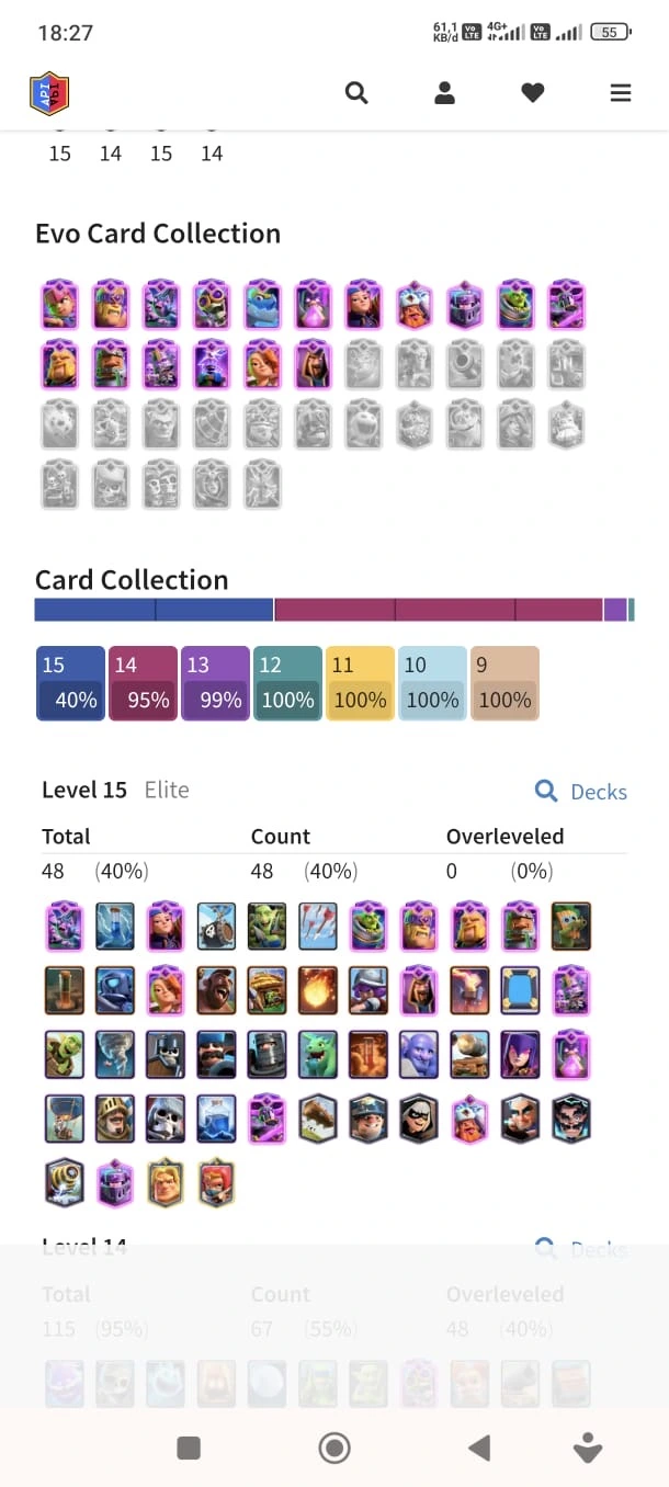 CR LV 64 🔥 Elite 48 🔥 Max Cards 115 ( Allmost max) 🔥 Evo 17 🔥 Emote 194 🔥 Trophy 12150 🔥 Change name free🔥