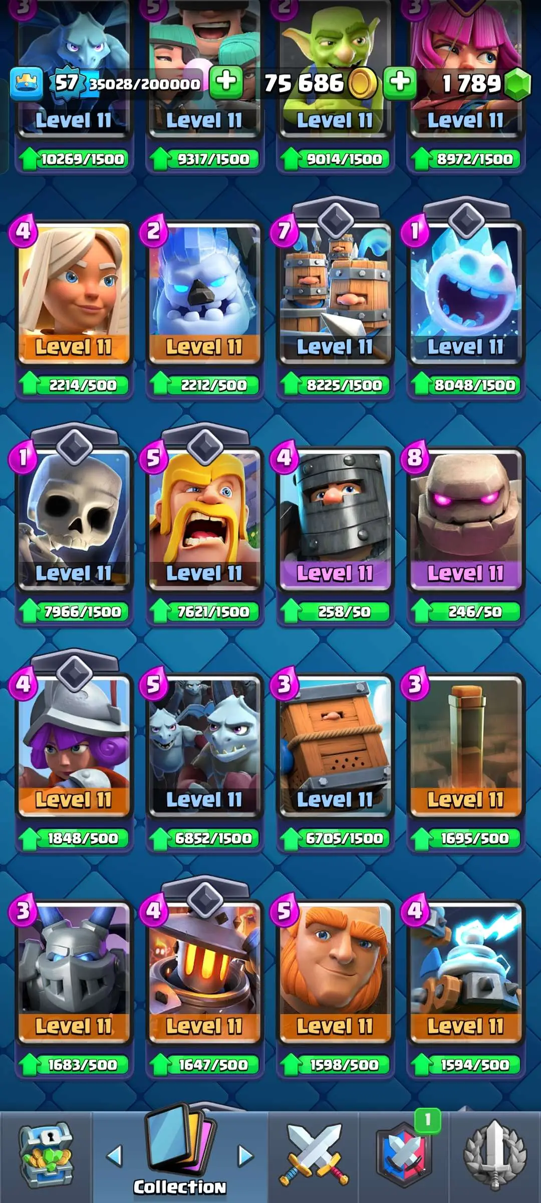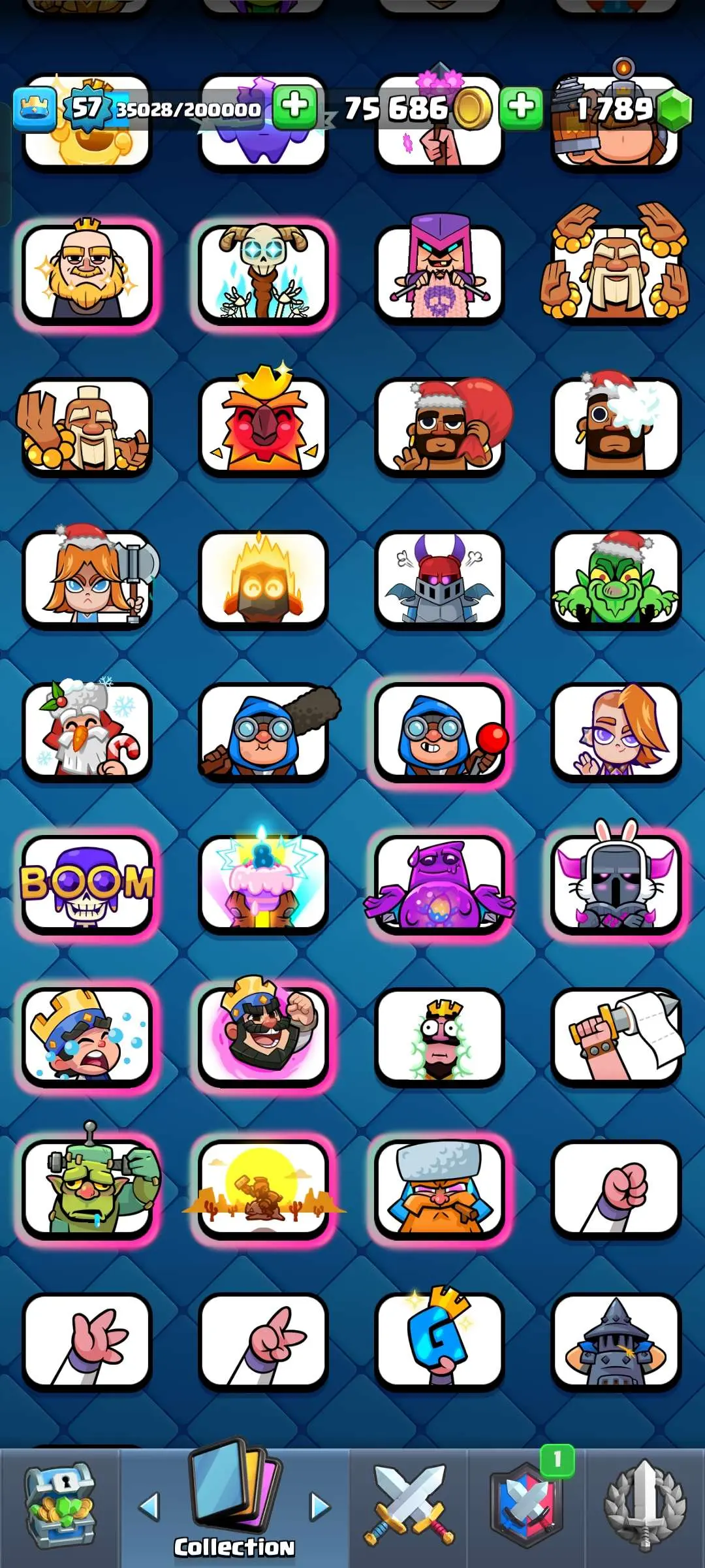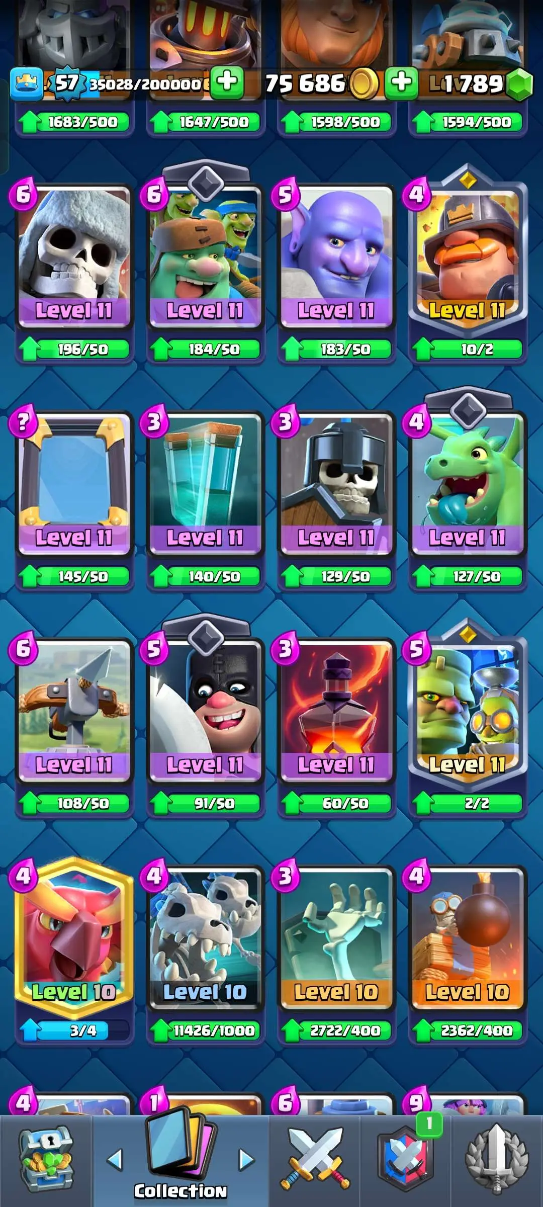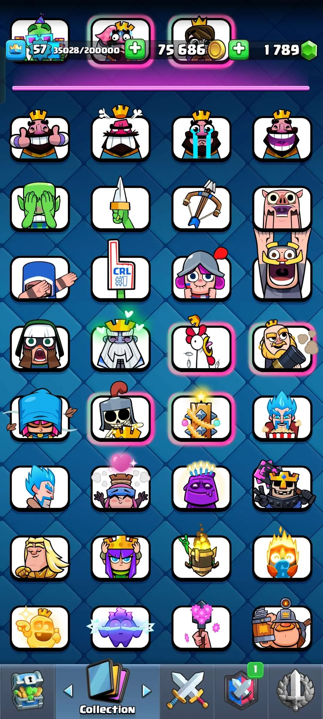 CR Lvl 57 ✨ 10000 Trophy ✨ KT 15 ✨ 11 Elite Cards ✨ 40 Max Cards ✨ 8 Evo Cards ✨ 92 Emotes ✨ 8 Tower skins