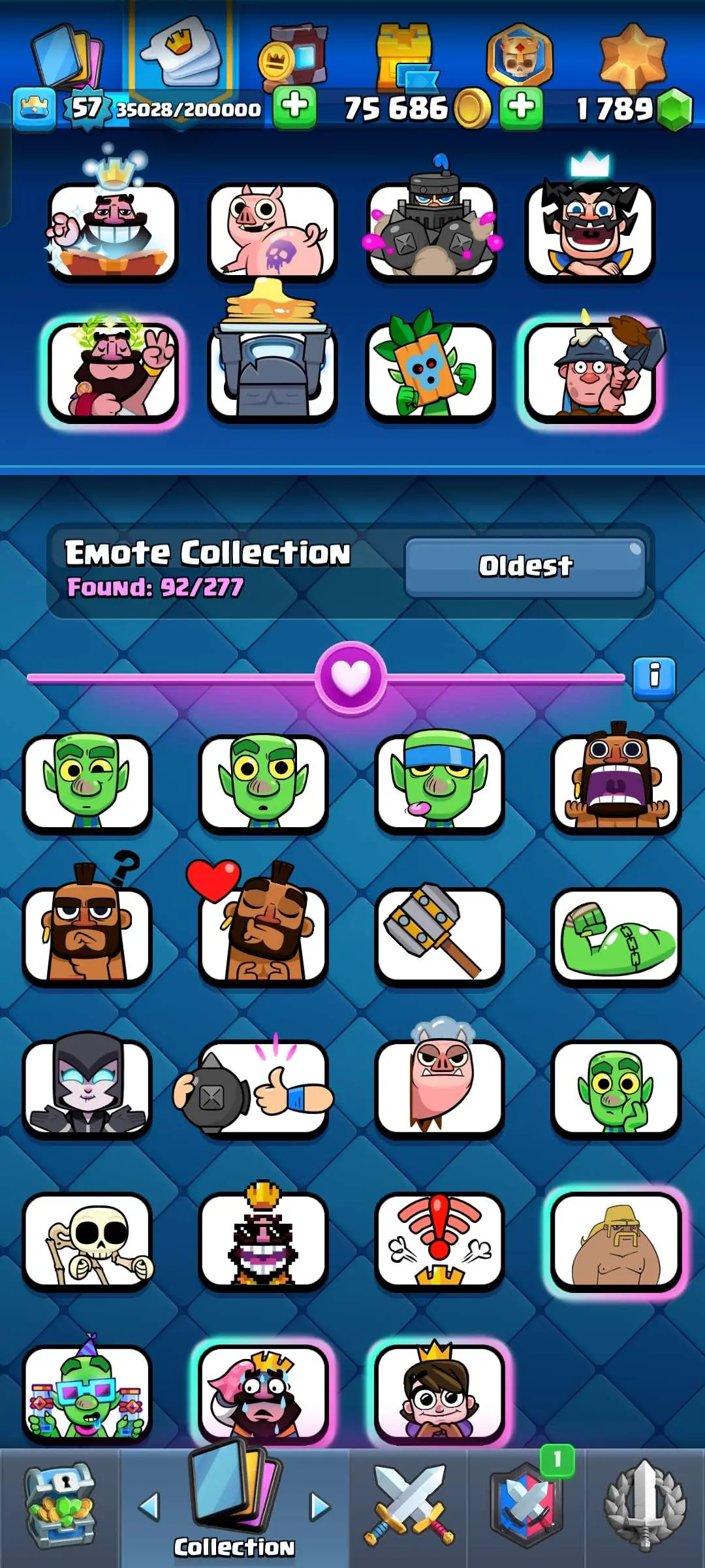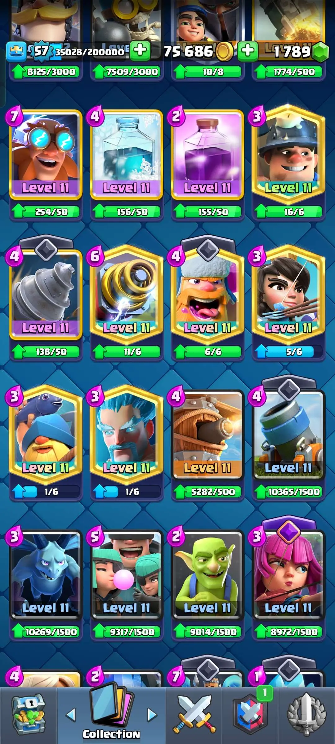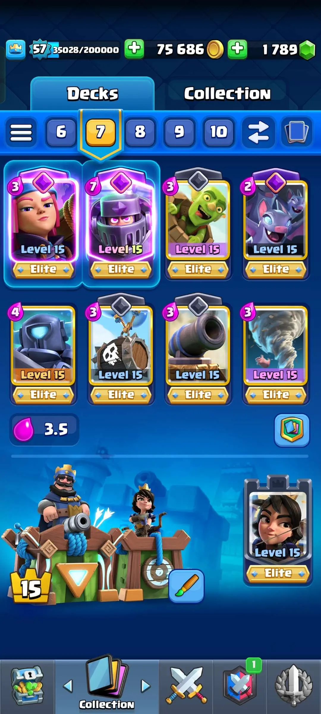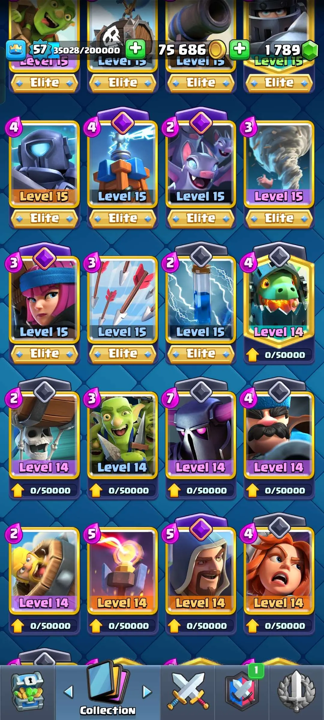 CR Lvl 57 ✨ 10000 Trophy ✨ KT 15 ✨ 11 Elite Cards ✨ 40 Max Cards ✨ 8 Evo Cards ✨ 92 Emotes ✨ 8 Tower skins