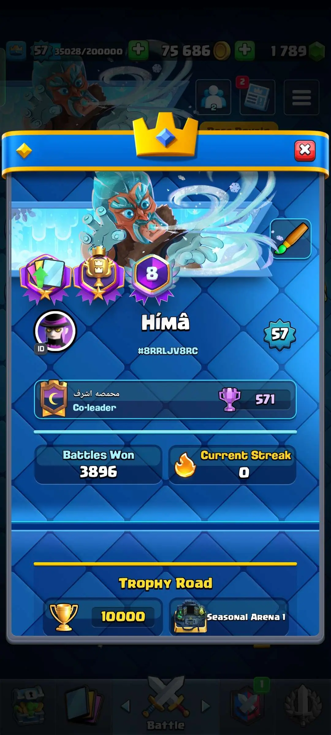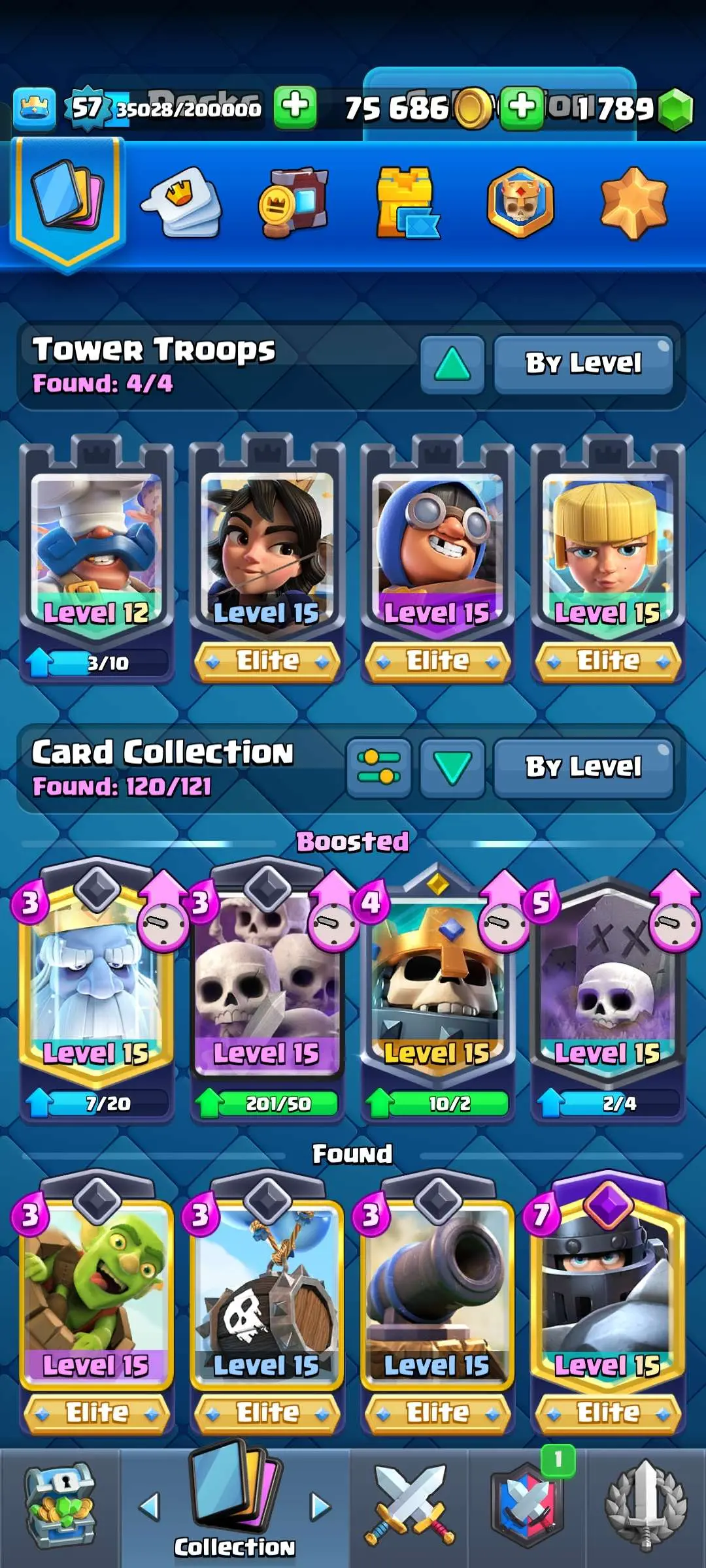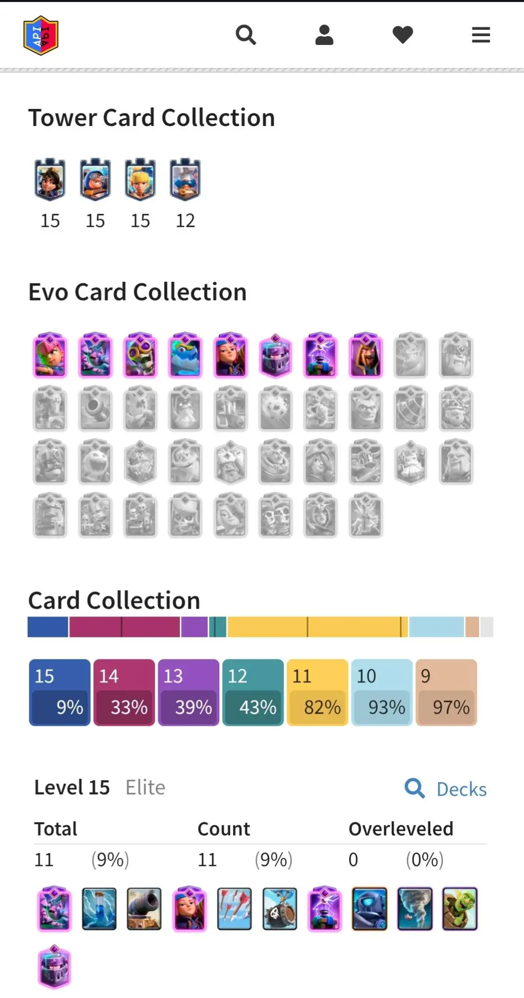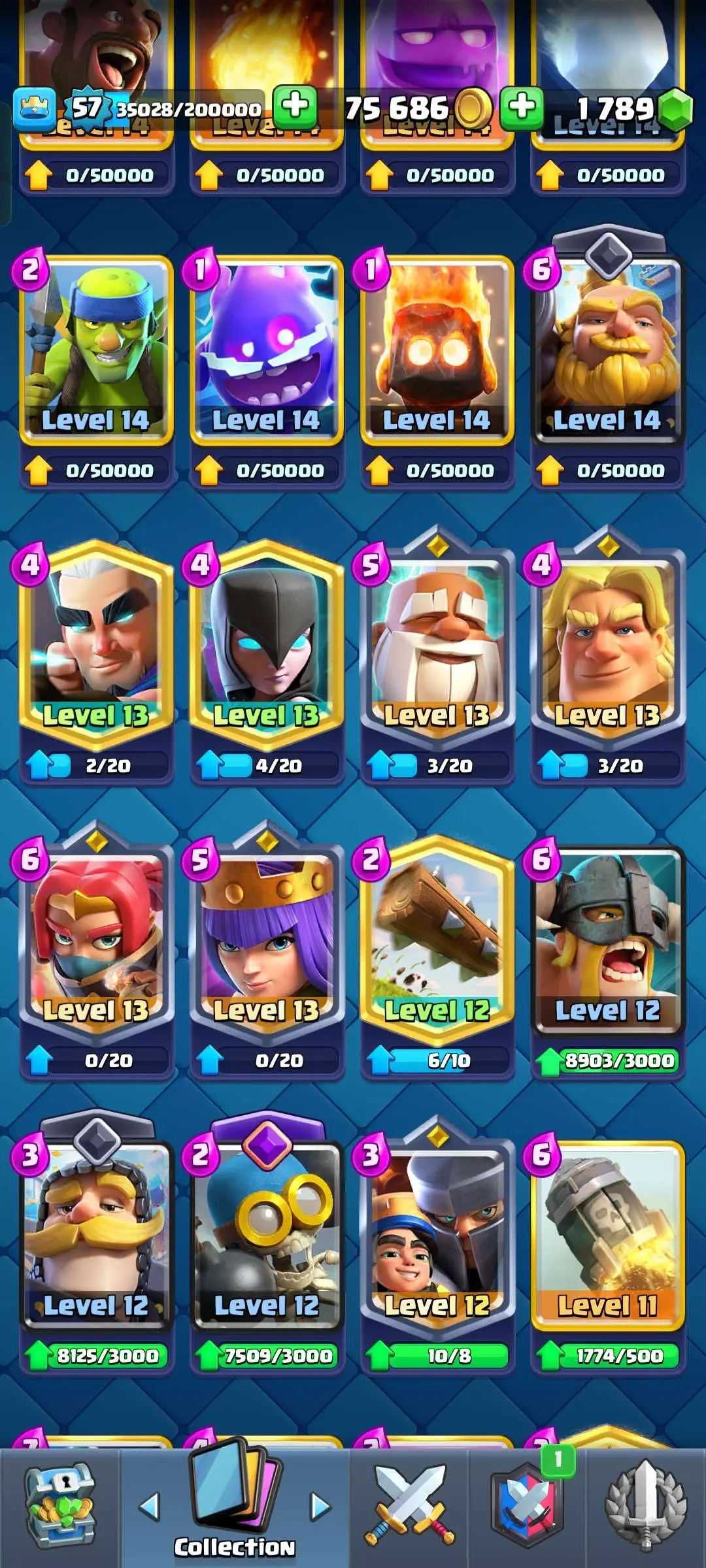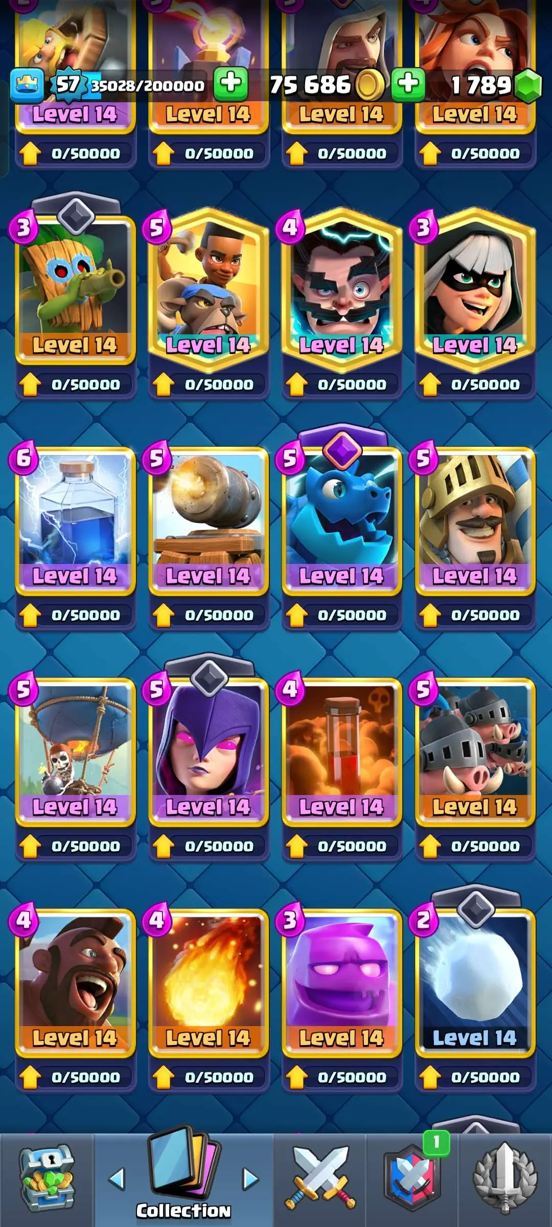 CR Lvl 57 ✨ 10000 Trophy ✨ KT 15 ✨ 11 Elite Cards ✨ 40 Max Cards ✨ 8 Evo Cards ✨ 92 Emotes ✨ 8 Tower skins