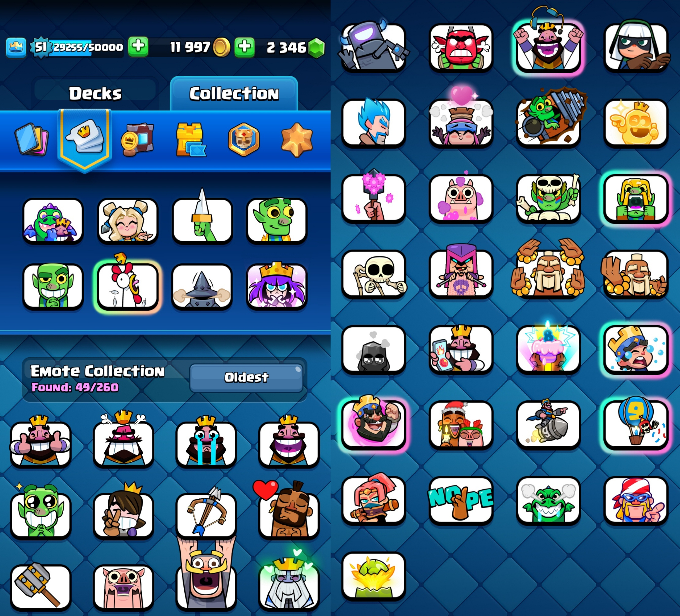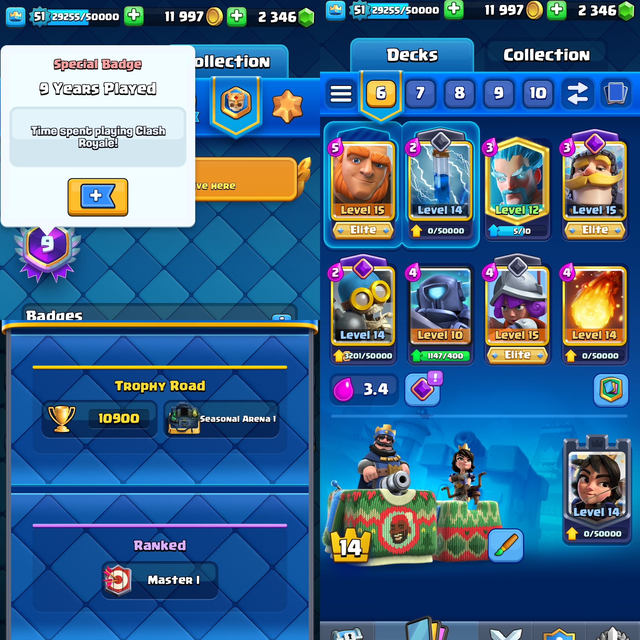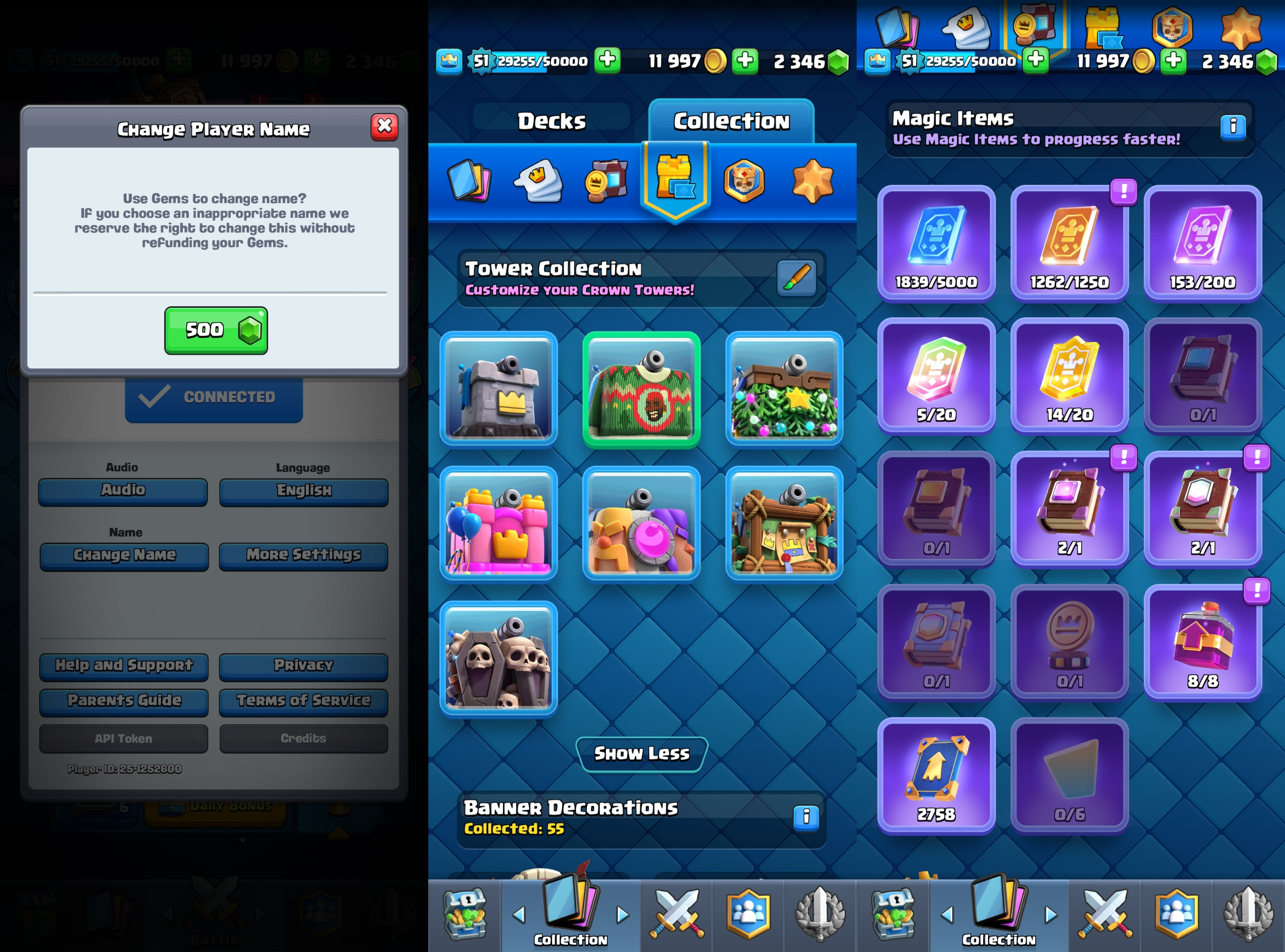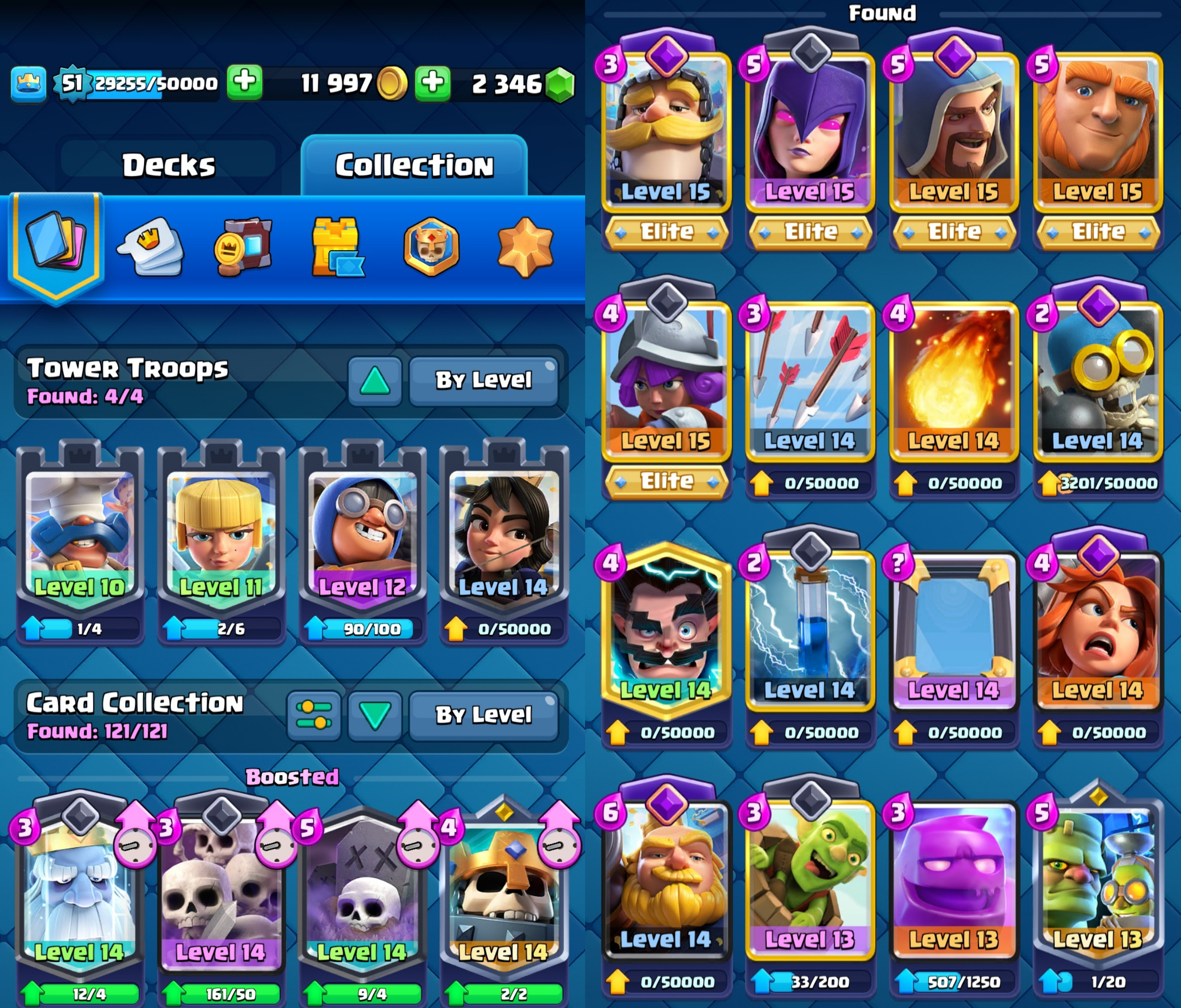 ⭐ KT 14 ⭐ 51 EXP ⭐ 11 EVOLUTION ⭐ 5 ELITE ⭐ 13 MAX CARD ⭐ 2300 GEMS ⭐ 6 TOWERSKINS ⭐ MAGIC ITEMS ⭐ RENAME AVALIABLE ⭐ 10900 Trophy
