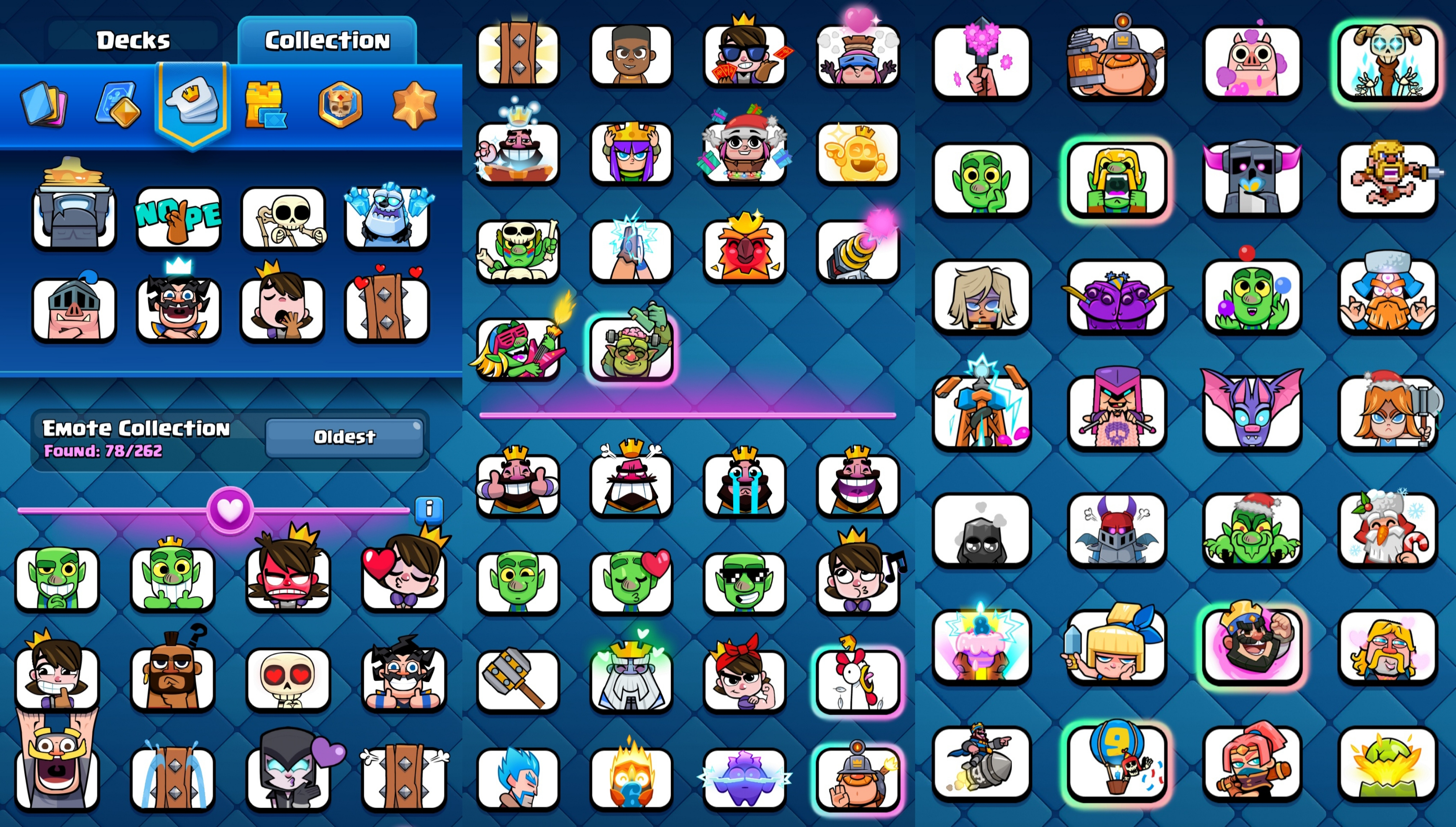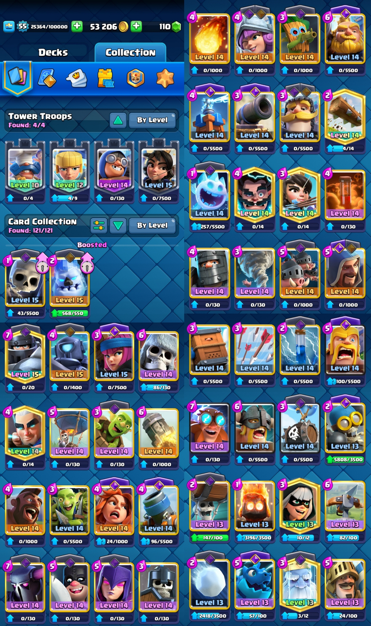 ⭐ KT 15 ⭐ KT Level 15 ⭐ Exp 55 ⭐ 3 Level 15 & 37 Level 14 Cards ⭐ 12 Evolution ⭐ 8 Towerskins ⭐ 78 Emotes ⭐ 9300 Trophies ⭐ Namechange 500