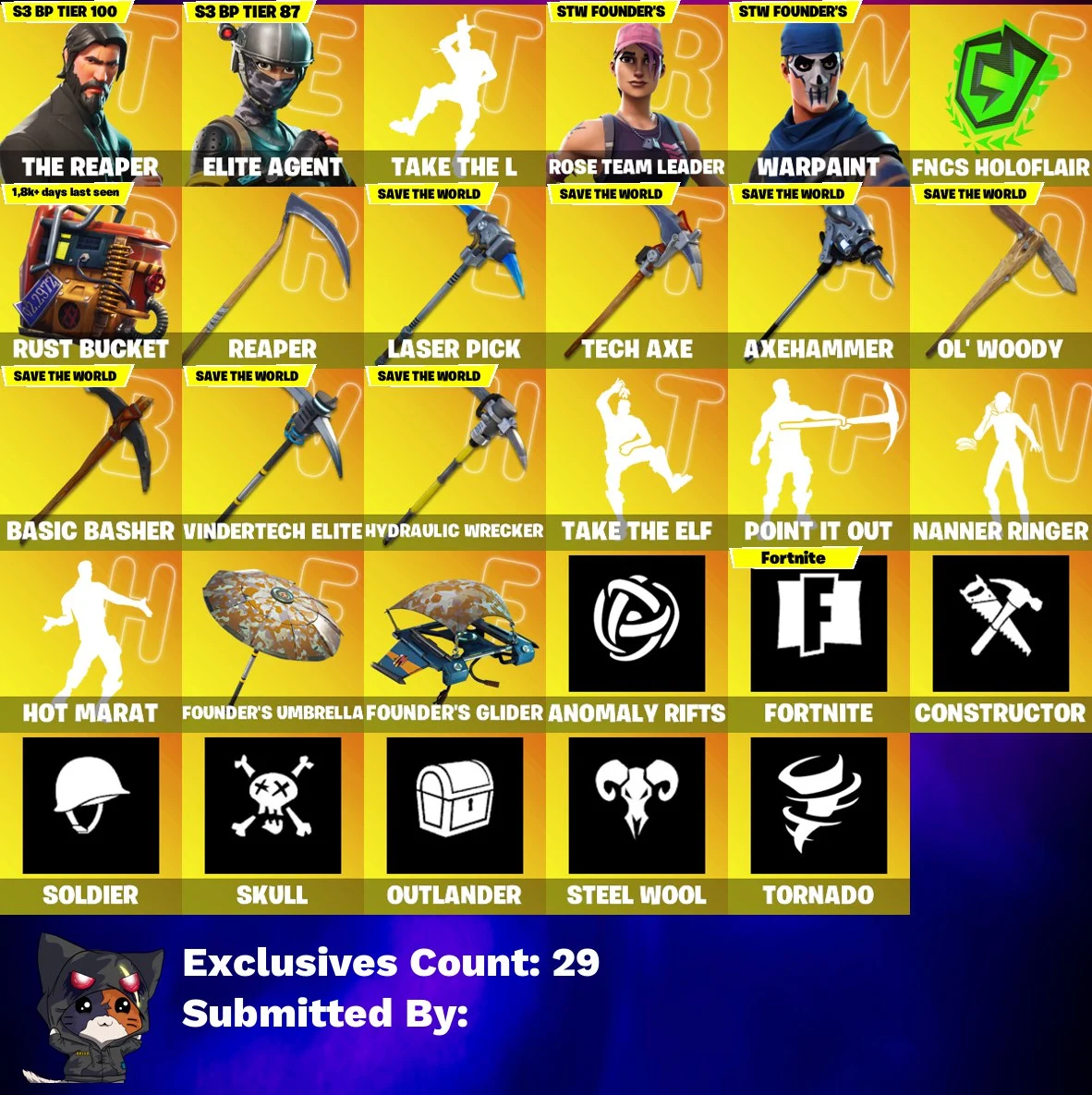 🛡️👑 104 HOMEBASE POWER 👑🛡️ 199 SKINS 💎 THE REAPER 💎 ELITE AGENT 💎 TAKE THE L 💎 FNCS HOLOFLAIR 💎 RUST BUCKET 💎 REAPER 💎 LASER PICK 💎 TECH AXE 💎 AXEHAMMER 💎 OL' WOODY 💎 VINDERTECH ELITE 💎 HYDRAULIC WRECKER 💎 115 VB 💎 OG STW 💎 FULL ACCESS 💎