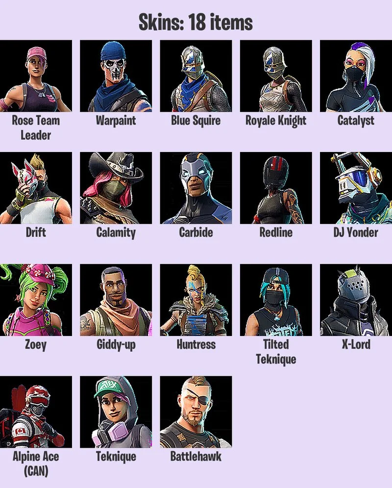 18 Skins|OG STW|Rose Team Leader|Warpaint|Blue Squire|Royale Knight|Catalyst|Drift|Calamity|Carbide|Redline|DJ Yonder|Zoey|Giddy-up