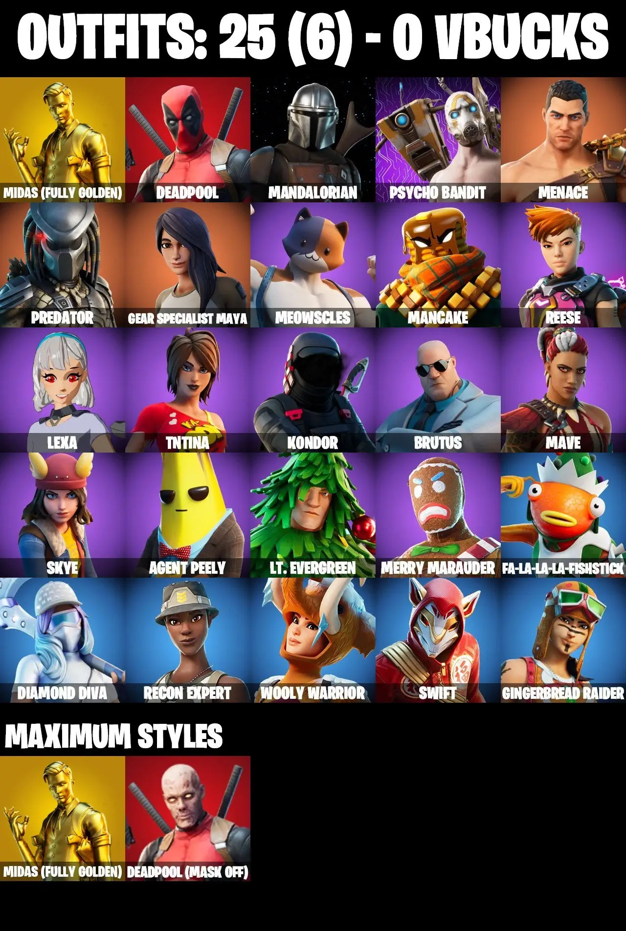 ❤️ 25 SKINS ❤️ PSYCHO BANDIT ❤️ MANDALORIAN ❤️ GOLDEN MIDAS ❤️ LAUGH IT UP ❤️ PREDATOR ❤️ AGENT PEELY ❤️ SKYE ❤️ MERRY MARAUDER ❤️ PEPPERMINT PICK ❤️ CAN PLAY ON PSN ❤️ XBOX ❤️ PC ❤️ NINTENDO ❤️ MOBILE ❤️ 0 VBUCKS ❤️