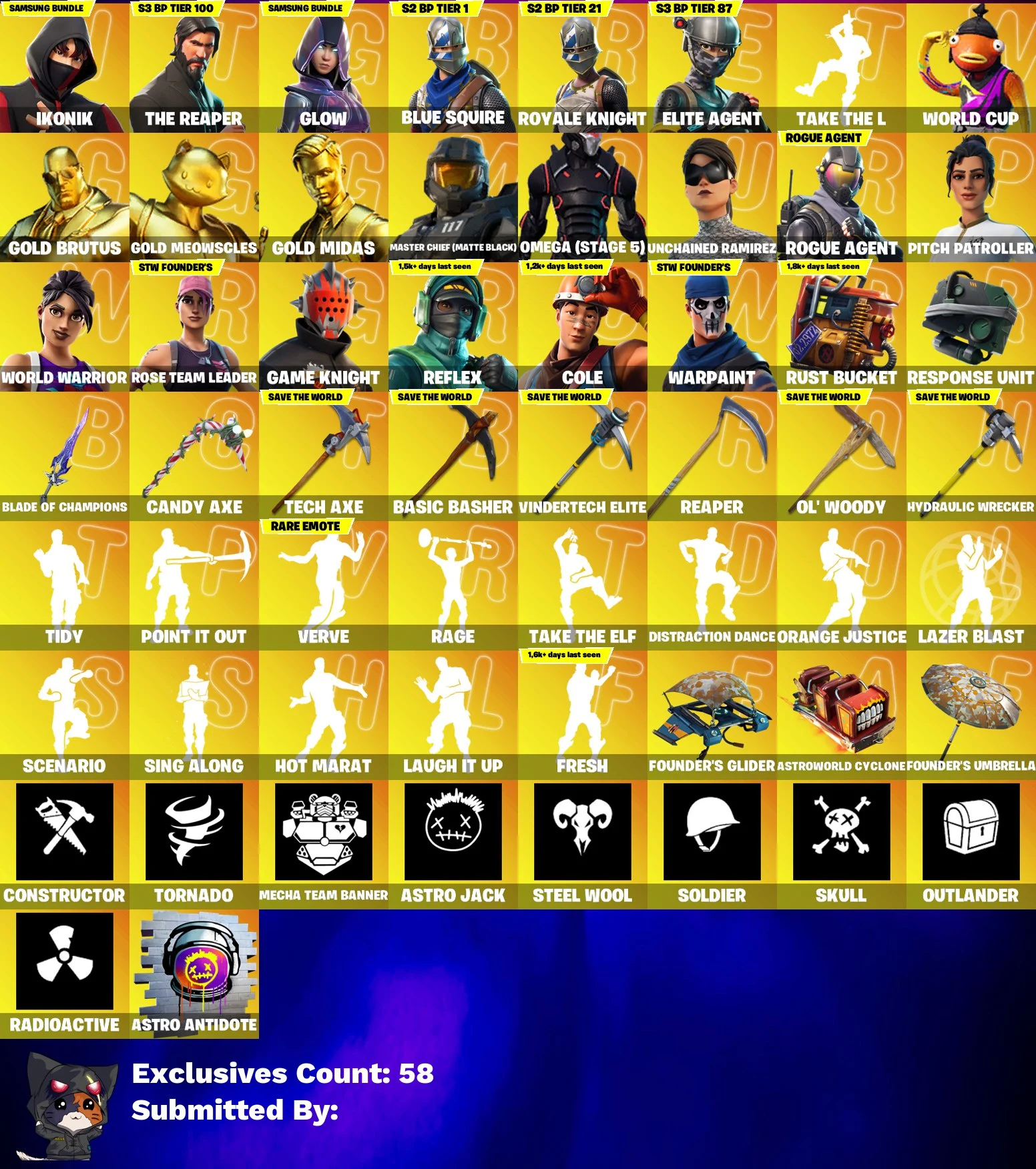💥🌟 EMAIL CAN CHANGE 🌟💥 412 SKINS 💎 IKONIK 💎 The Reaper 💎 Glow 💎 Renegade Raider 💎 Blue Squire 💎 Royale Knight 💎 Scenario 💎 Take The L 💎 Gold Brutus 💎 Gold Meowscles 💎 Gold Midas 💎 OG STW 💎 FULL ACCESS 💎