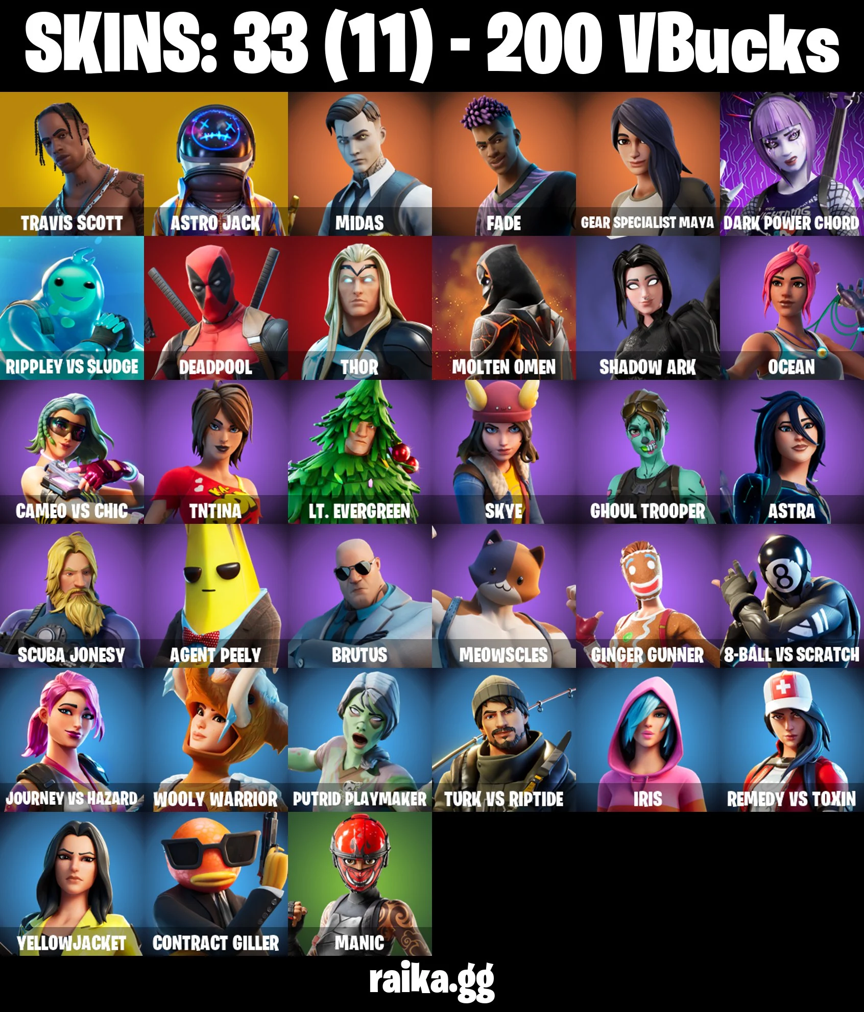 ⭐ Inactive for 3 years | PC/PSN/XBOX | 33 skins | Travis Scott | Merry Mint Axe | Astro Jack | Midas | Fade | Gear Specialist Maya | Dark Power Chord | Rippley vs Sludge | Deadpool | Thor | Molten Omen | 200 VB