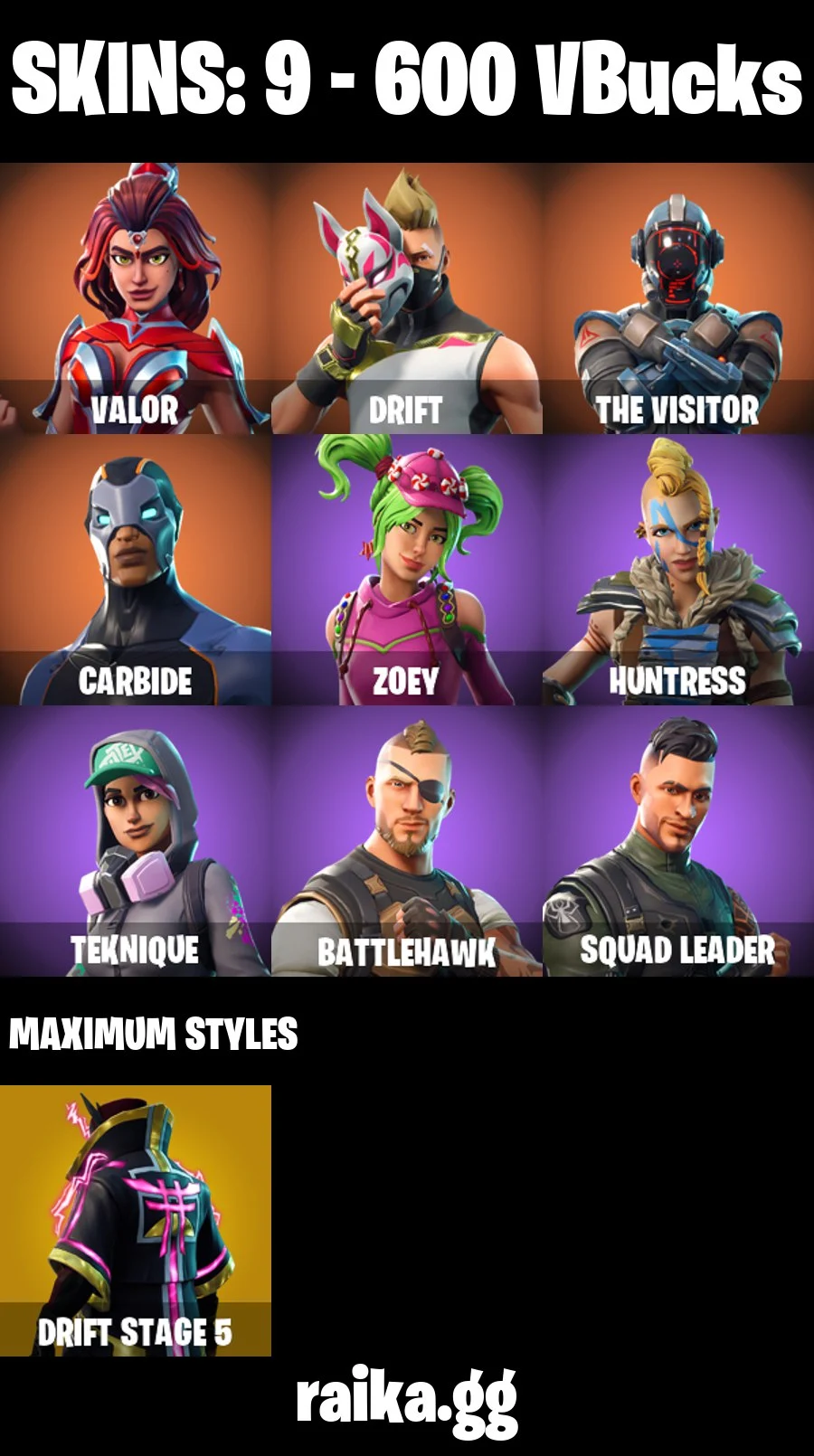 ⭐ Inactive for 3 years | PC/PSN/XBOX | 9 skins | Valor | Drift | The Visitor | Carbide | Zoey | Huntress | Teknique | Battlehawk | Squad Leader | Rust Bucket | Clawz Retro | Offworld Rig | 600 VB