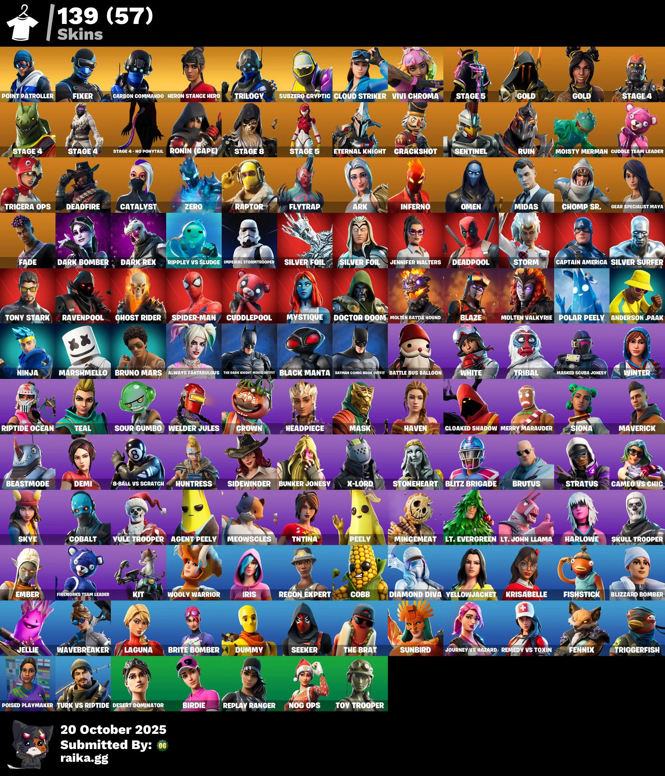 [PC] 139 skins | Tony Stark | Peely | Deadpool | Harley Hitter | Mystique | Jabba Switchway | Laugh It Up mssh773