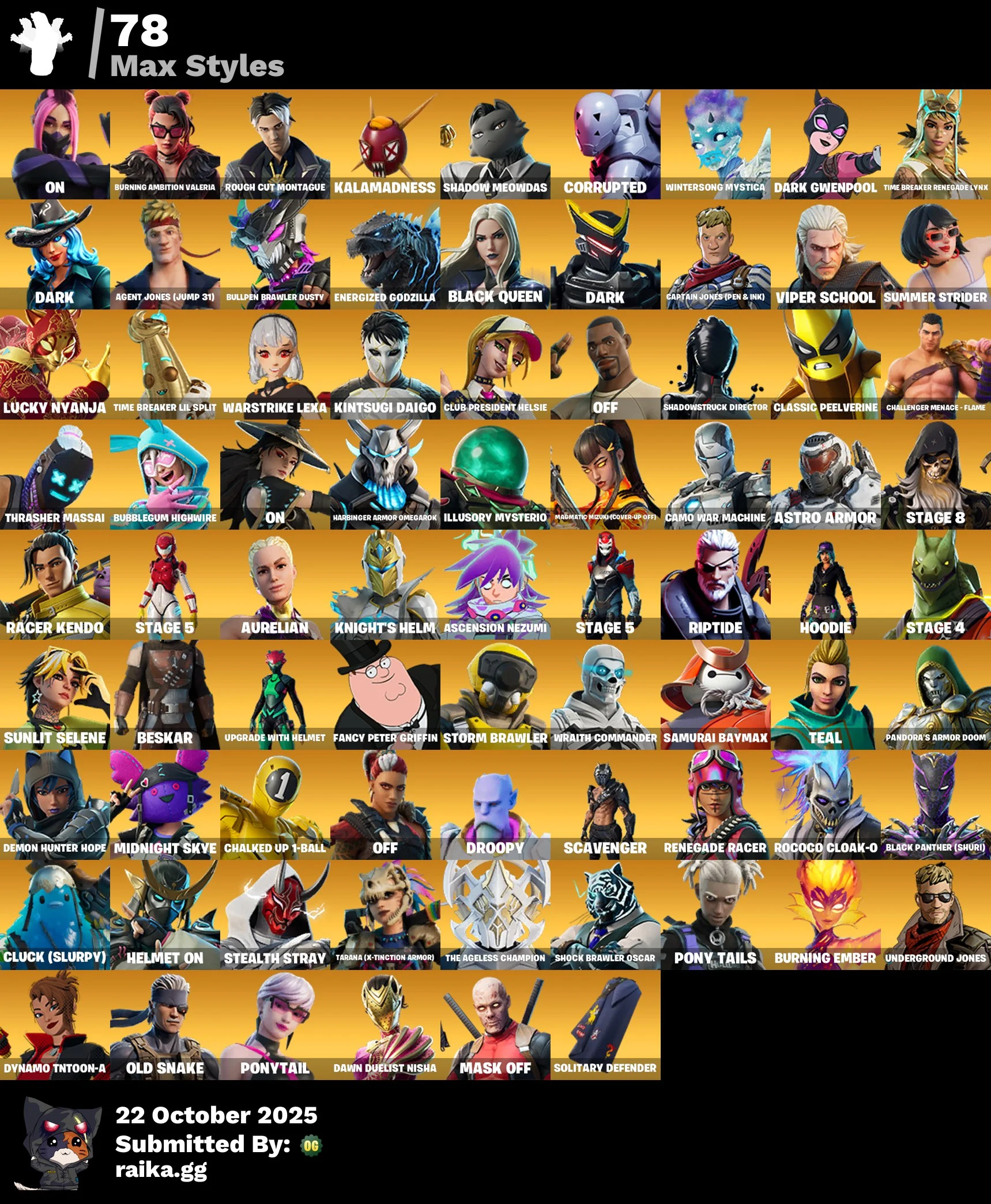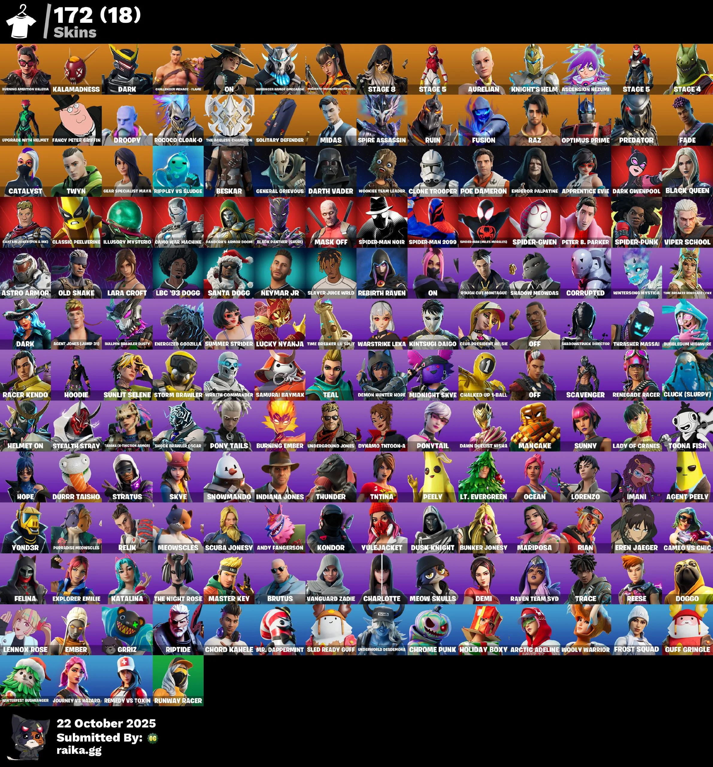 [PC/PSN] 172 skins | Lara Croft | Spider-Man (Miles Morales) | Peely | Catalyst | Eren Jaeger | Optimus Prime	Mam46
