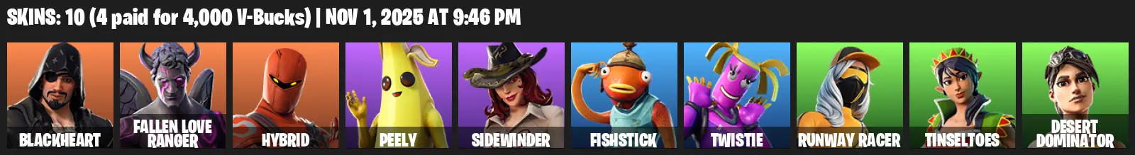 [PC/PSN/XBOX] | 10 skins | Blackheart | Fallen Love Ranger | Hybrid | Peely | Sidewinder | Fishstick | Twistie | Runway Racer | #CZV7618 | #MBFN