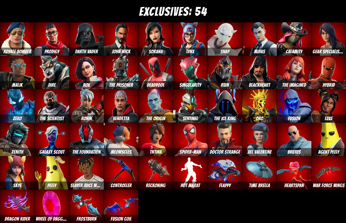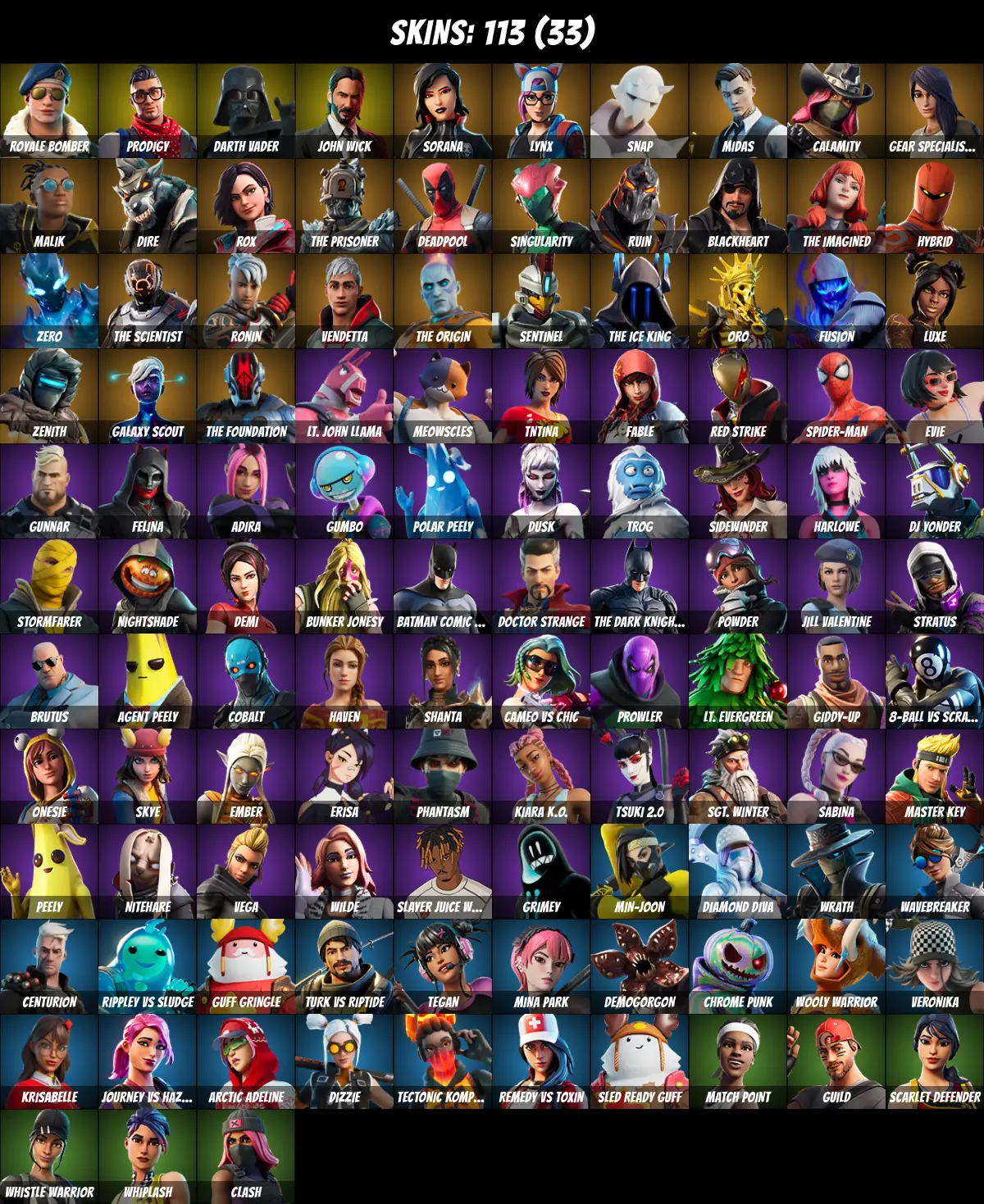 ⚡PC/PSN/XBOX⚡ 113 skins 💎 Royale Bomber 💎 John Wick 💎 Deadpool 💎 Midas 💎 Darth Vader 💎 Lynx 💎 Peely 💎 Agent Peely 💎 Calamity 💎 Spider-Man 💎 Demogorgon 💎 Meowscles 💎 Snap 💎 TNTina 💎 Brutus 💎 Doctor Strange 💎 Prodigy 💎 Sorana 💎 550 V-Bucks 💎