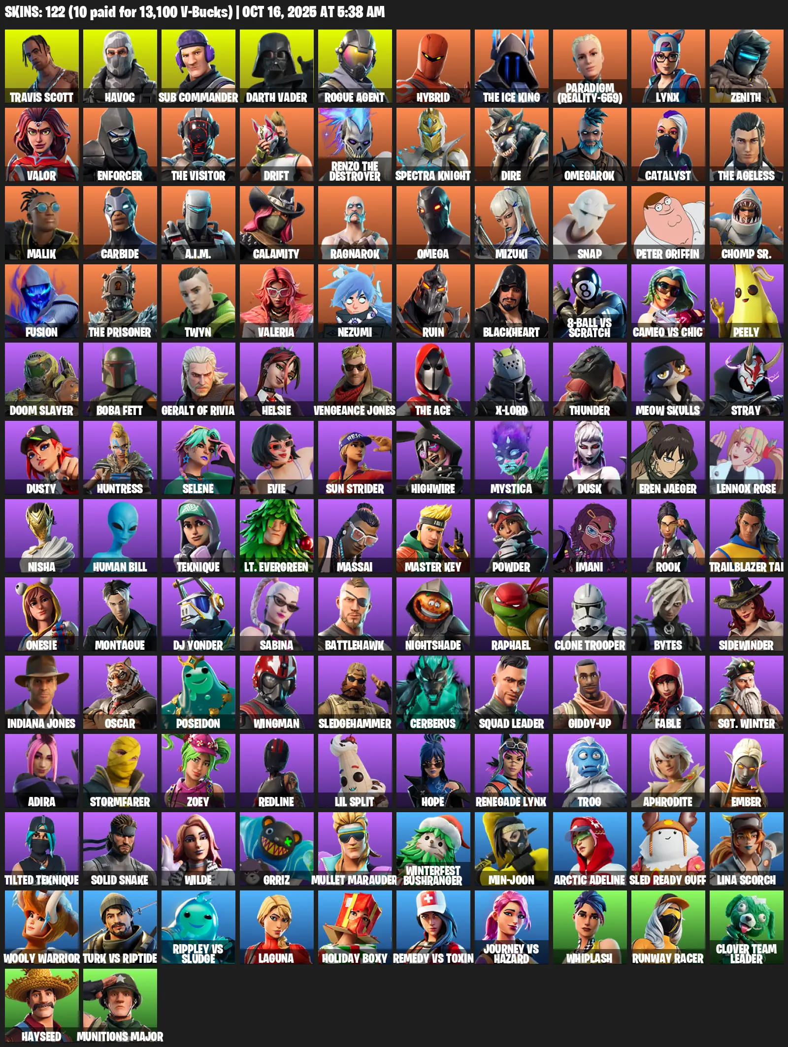 [PC/PSN/XBOX] | 122 skins | Travis Scott | Omega | Havoc | Sub Commander | Darth Vader | Rogue Agent | Hybrid | The Ice King | #HUU0707 | #MBFN