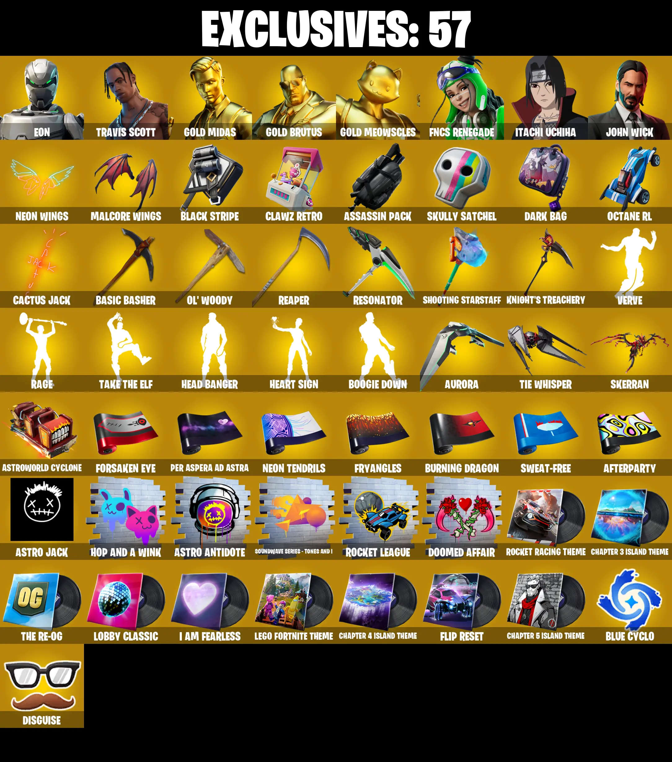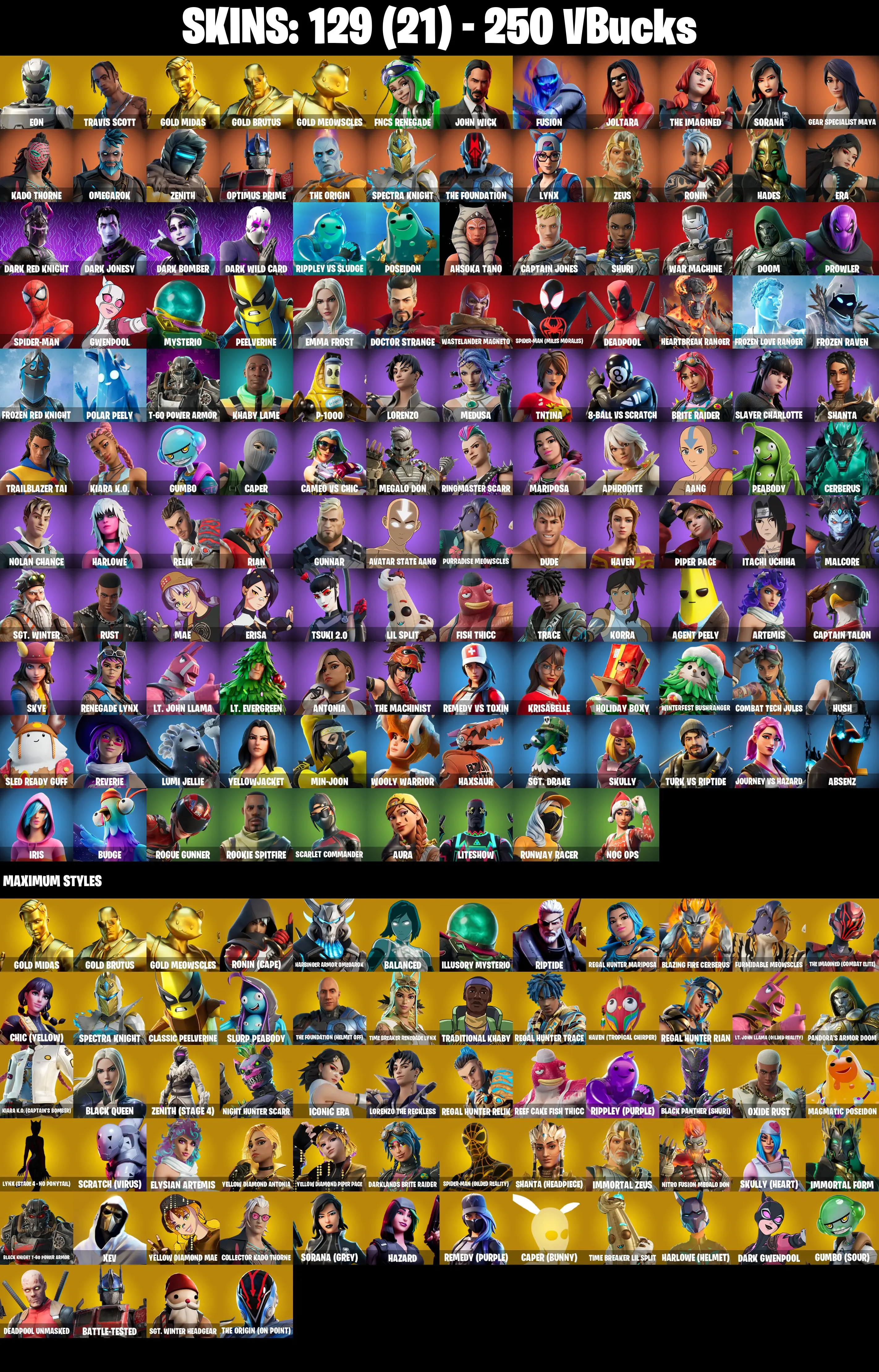 💰 [PC/PSN/XBOX] 129 SKINS | Eon, Travis Scott, Gold Midas, Gold Brutus, Gold Meowscles, FNCS Renegade, John Wick, Fusion, Joltara, The Imagined, Sorana, Gear Specialist Maya, Kado Thorne, Omegarok, Zenith, Optimus Prime, The Origin, Spectra Knight