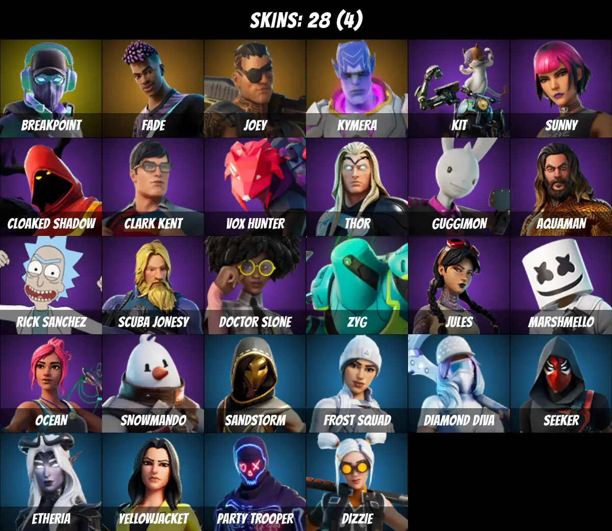 ⚡PC/PSN/XBOX⚡ 28 skins 💎 Rick Sanchez 💎 Jules 💎 Thor 💎 Marshmello 💎 Joey 💎 Breakpoint 💎 Kymera 💎 Fade 💎 Ohm 💎 Kit 💎 Sunny 💎 Cloaked Shadow 💎 Clark Kent 💎 Vox Hunter 💎 Guggimon 💎 Aquaman 💎 Scuba Jonesy 💎 Doctor Slone 💎 Zyg 💎 Ocean 💎 200 V-Bucks 💎