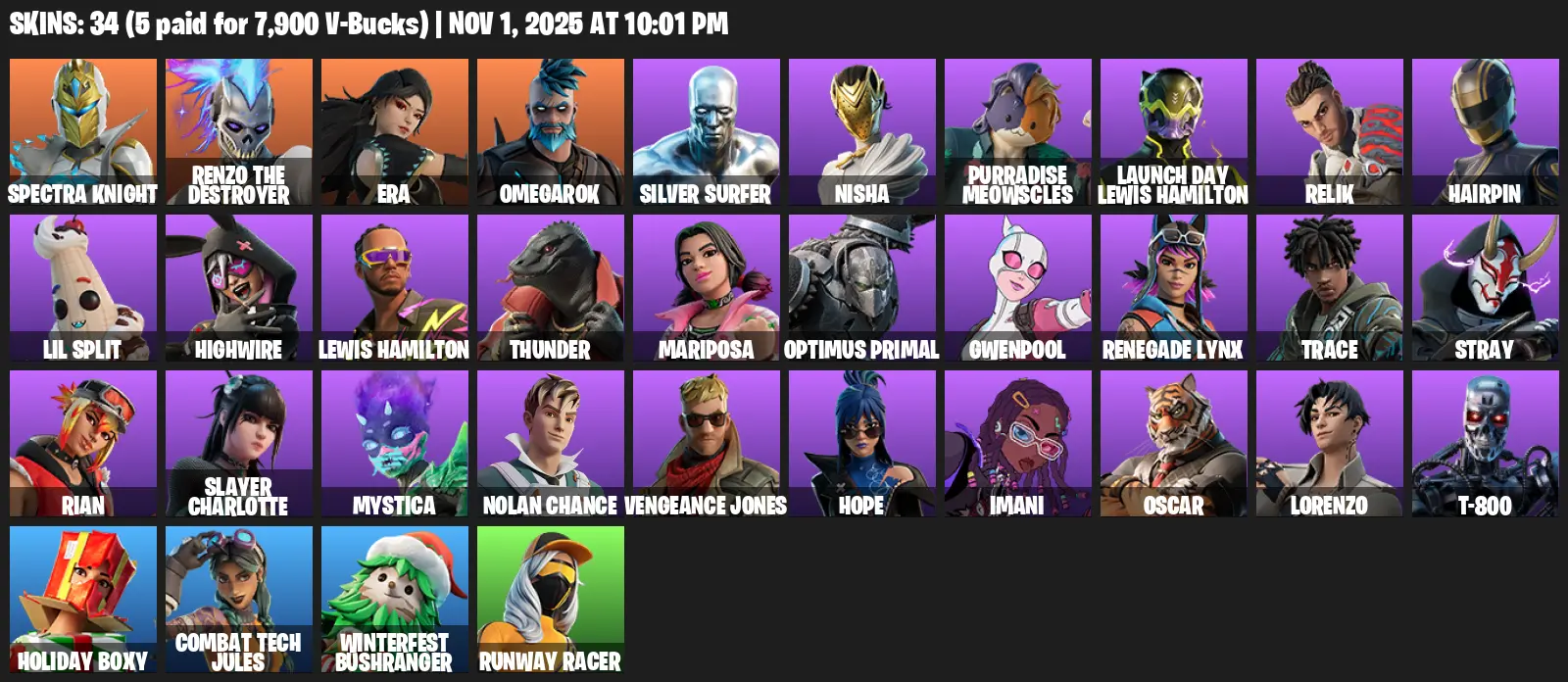 [PC/PSN/XBOX] | 34 skins | Spectra Knight | Renzo the Destroyer | Era | Omegarok | Silver Surfer | Nisha | Purradise Meowscles | #WFU4318 | #MBFN