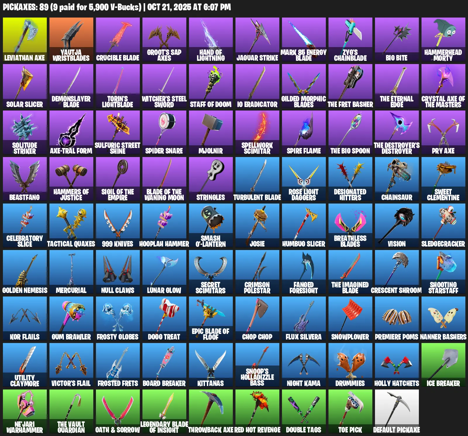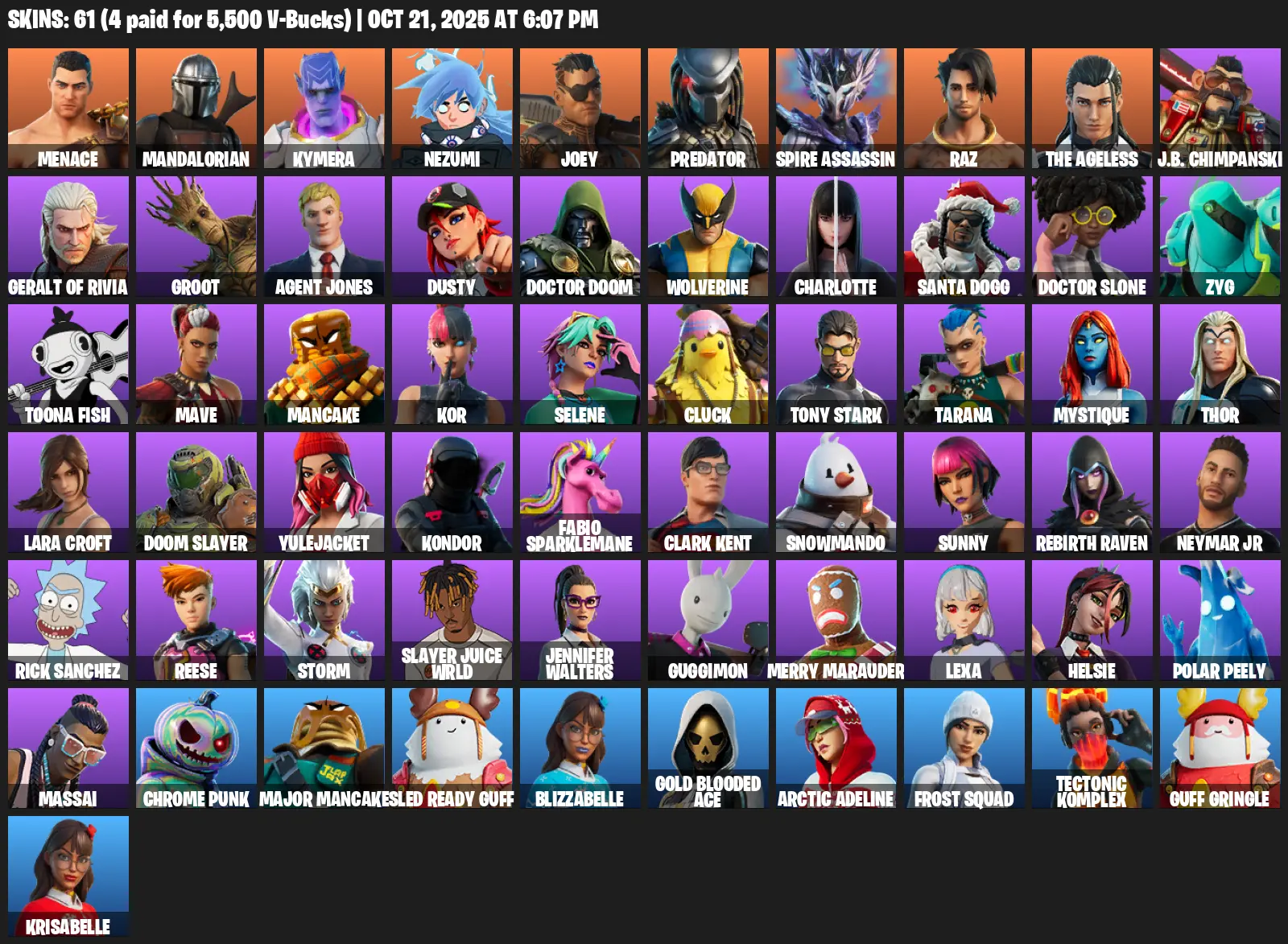 [PC/PSN/XBOX] | 61 skins | 1300 V-bucks | Leviathan Axe | Lara Croft | Menace | Mandalorian | Kymera | Nezumi | Joey | Predator | Spire Assassin | S4G