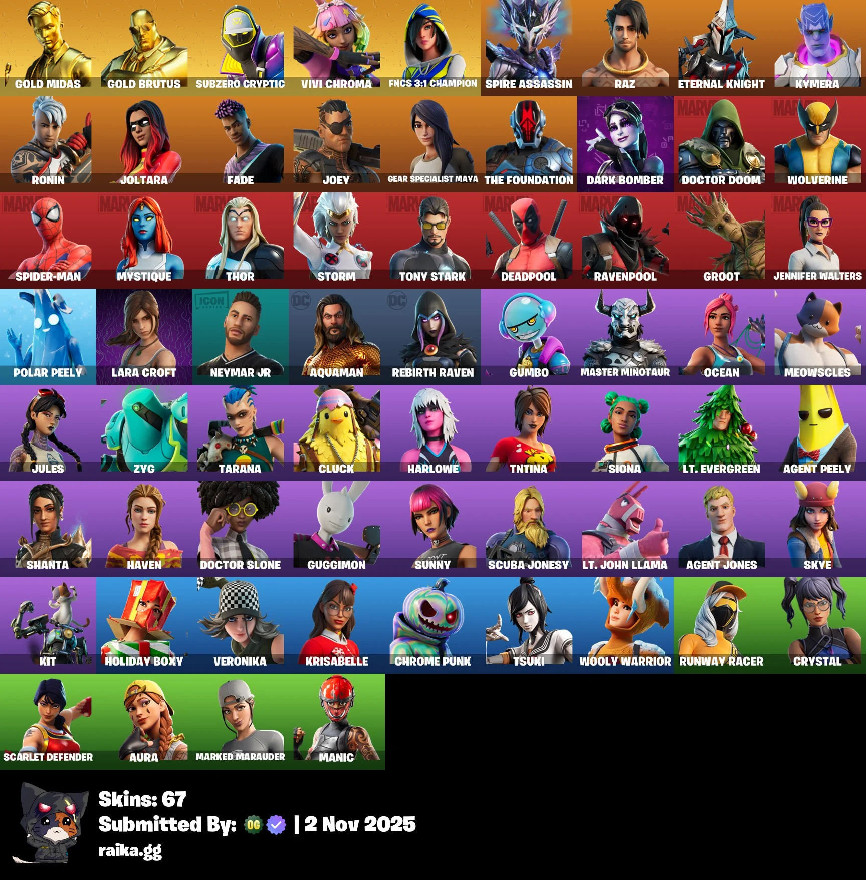 [PC/PSN/XBOX] 67 skins | Gold Midas | Gold Brutus | Subzero Cryptic | Vivi Chroma | FNCS 3:1 Champion | Spire Assassin | Raz | Eternal Knight | Kymera | 200 VB