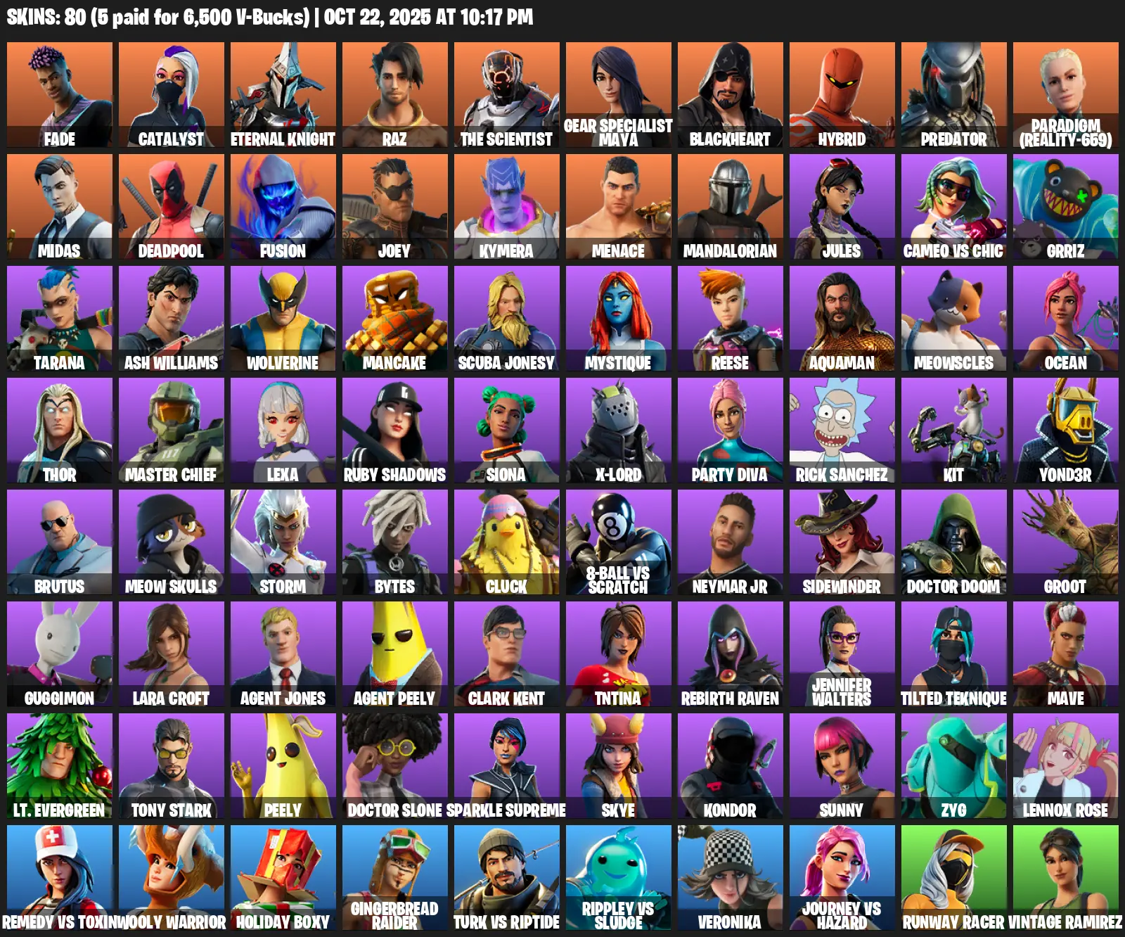 [PC/PSN/XBOX] | 80 skins | Lara Croft | Fade | Catalyst | Eternal Knight | Raz | The Scientist | Gear Specialist Maya | Blackheart | #RTO5584 | #MBFN
