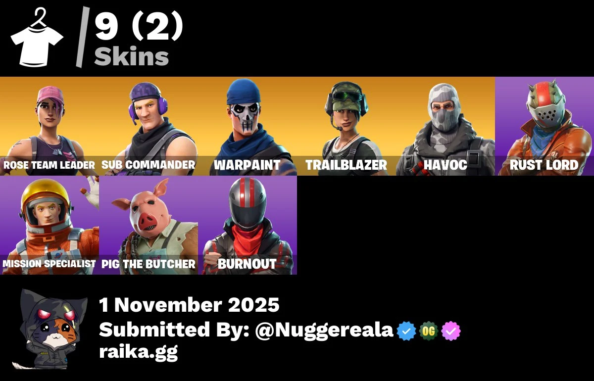 [PC/PSN/XBOX] 9 skins | OG STW | Sub Commander | Trailblazer | Havoc | Rust Lord | Mission Specialist | Pig the Butcher | Burnout | Skirmish | Backup Plan | 50 VB