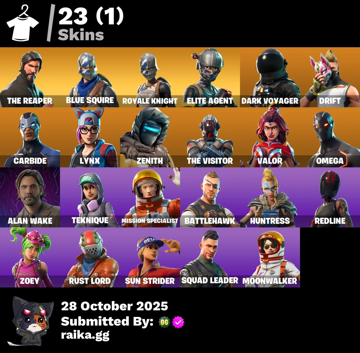 PC/PSN/Xbox/Nintendo 23 skins | The Reaper | Floss | Blue Squire | Royale Knight | Elite Agent | Dark Voyager | Drift | Carbide | Lynx | Zenith | The Visitor | Valor | Omega | 50 VB