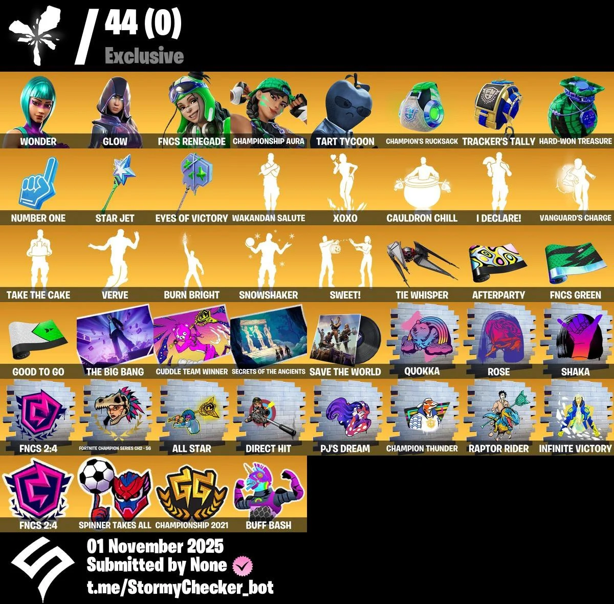 [PC/XBL/PSN] | 218 Skins | Wonder | Glow | FNCS Renegade | Championship Aura | Tart Tycoon | Star Jet | Eyes of Victory | Close Shave | 600 VB