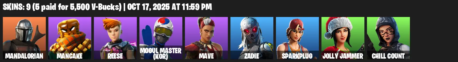 [PC/XBOX] | 9 skins | Leviathan Axe | Mandalorian | Mancake | Reese | Mogul Master (KOR) | Mave | Zadie | Sparkplug | Jolly Jammer | Chill Count | S4G