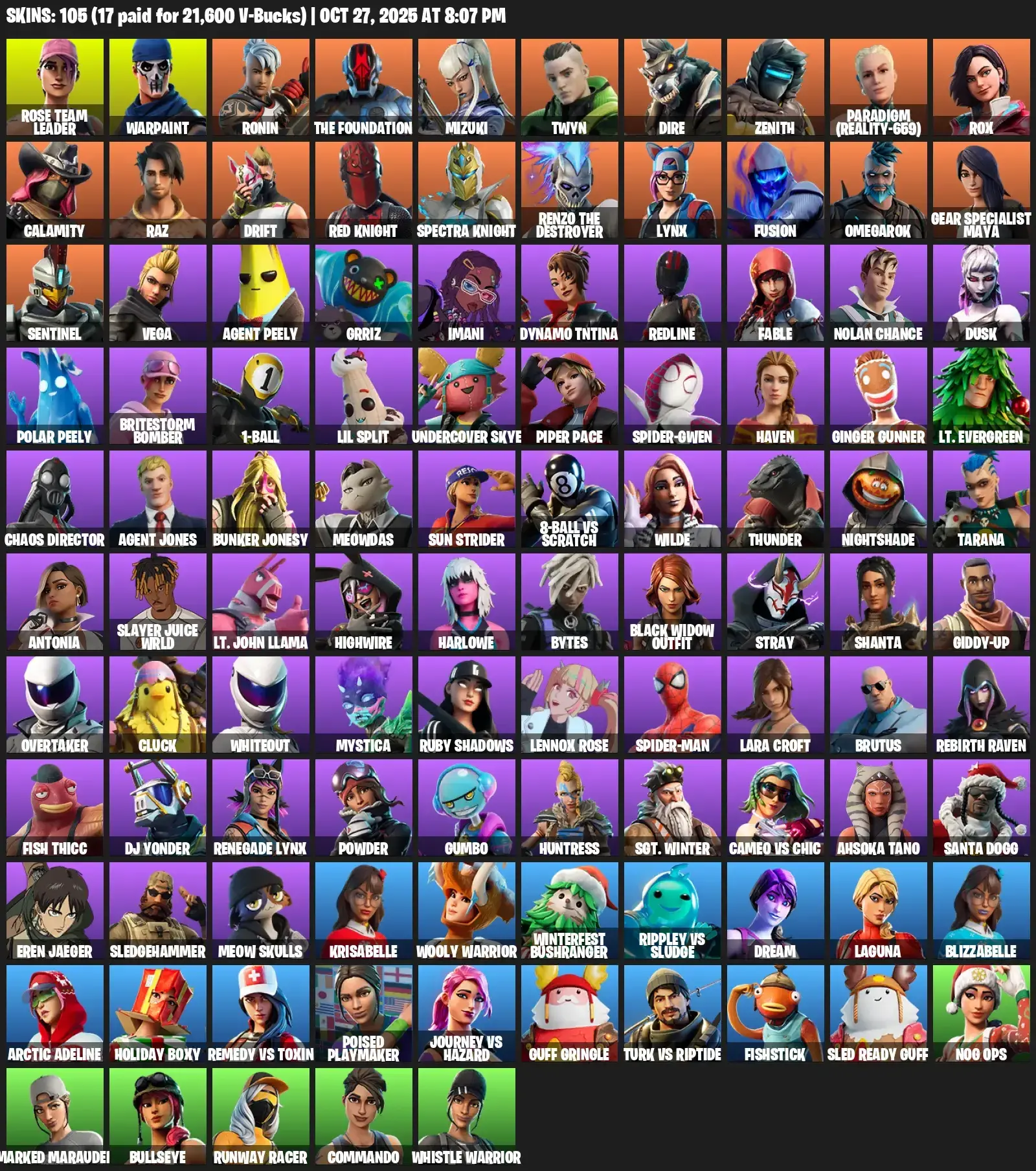 [PC/XBOX] | 105 skins | 2800 V-bucks | OG STW | Lara Croft | Rose Team Leader | Warpaint | Ronin | The Foundation | Mizuki | Twyn | #PHD0880 | #MBFN
