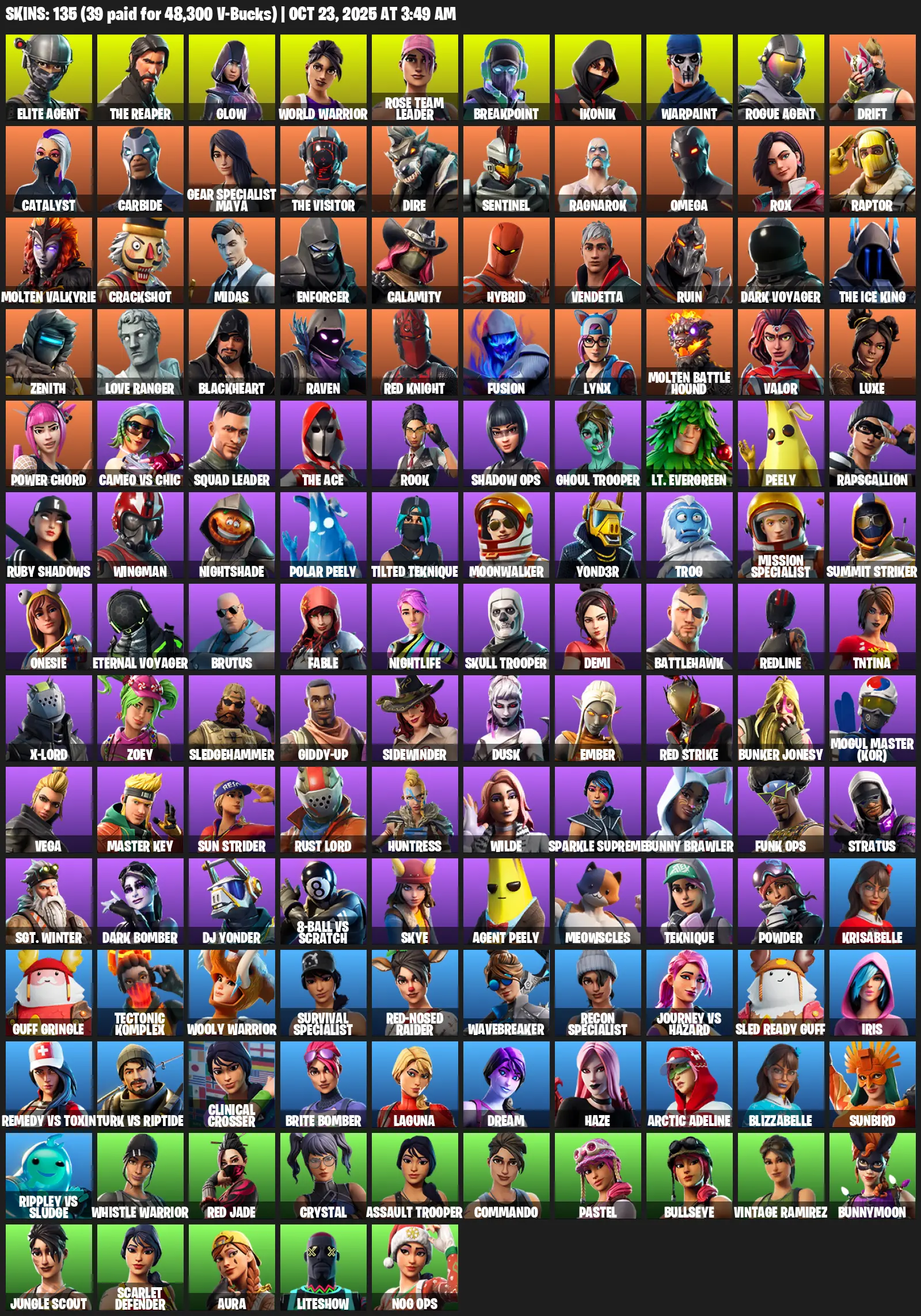 [PC/XBOX/PSN] 135 Skins | Elite Agent | The Reaper | Glow | World Warrior | Rose Team Leader | Breakpoint | IKONIK | Warpaint | Rogue Agent | Drift | Catalyst | Carbide | Gear Specialist Maya | The Visitor | Dire | Sentinel | Ragnarok | Omega | Rox