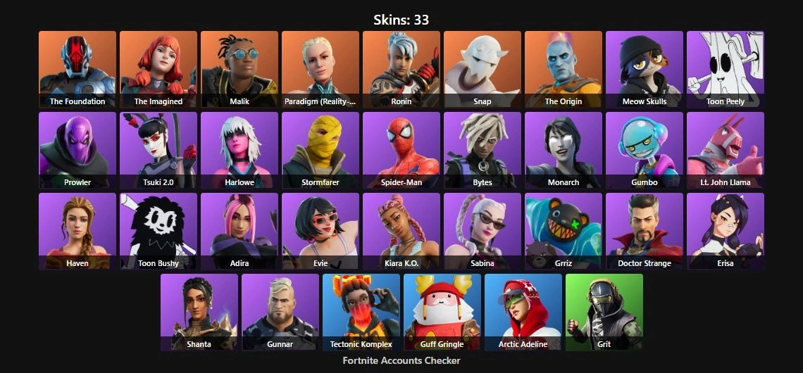 PC/XBOX/PSN 33 Skins⭐️ | The Foundation | The Imagined | Malik | Paradigm (Reality-659) | Ronin | Snap | The Origin | Meow Skulls | Toon Peely | Prowler