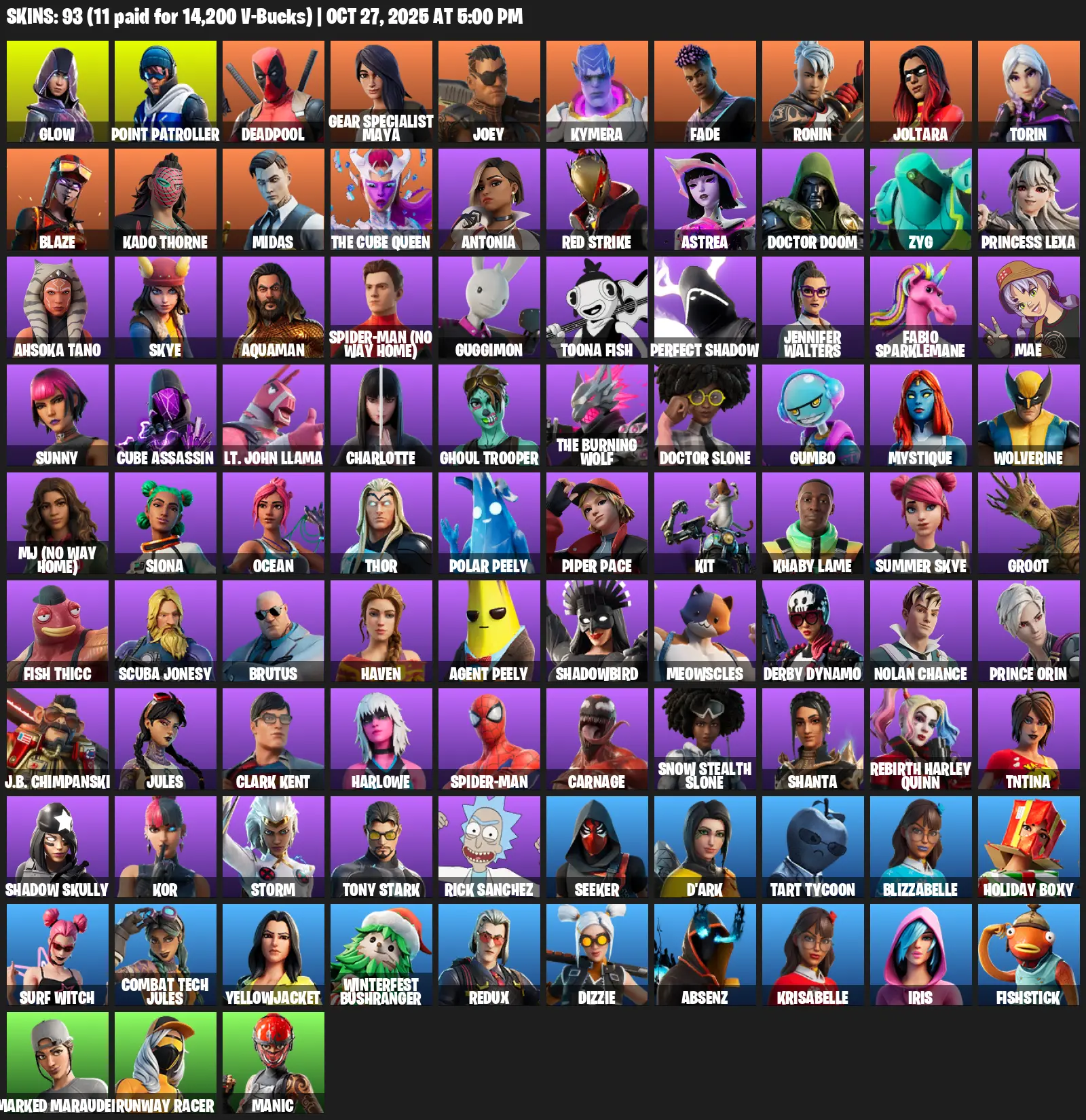 [PC/XBOX/PSN] 93 Skins | Glow | Point Patroller | Deadpool | Gear Specialist Maya | Joey | Kymera | Fade | Ronin | Joltara | Torin | Blaze | Kado Thorne | Midas | The Cube Queen | Antonia | Red Strike | Astrea | Doctor Doom | Zyg | Princess Lexa