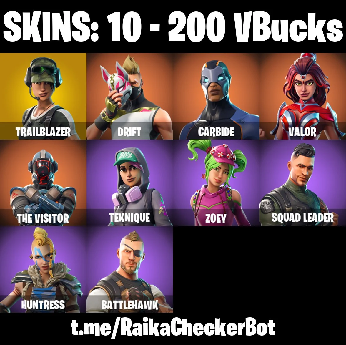 [PSN/XBOX/PC] 10 skins | Trailblazer | Drift | Carbide | Valor | The Visitor | Teknique | Zoey | Squad Leader | Huntress | Battlehawk | Rust Bucket | 200 VB