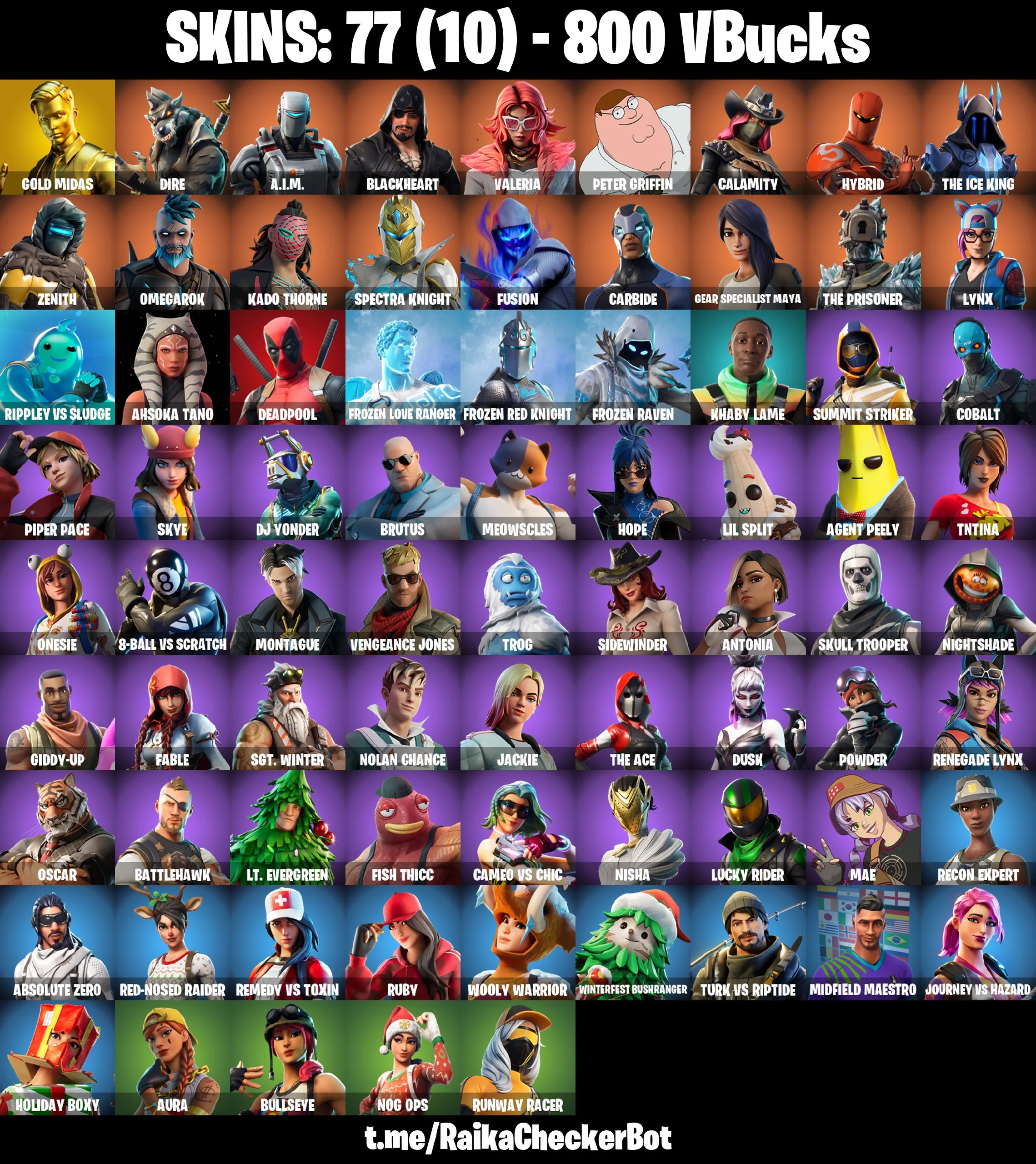 [PSN/XBOX/PC] 77 skins ❄️ Gold Midas ❄️ Dire ❄️ A.I.M. ❄️ Blackheart ❄️ Valeria ❄️ Peter Griffin ❄️ Calamity ❄️ Hybrid ❄️ The Ice King ❄️ Zenith ❄️ Omegarok ❄️ 800 VB
